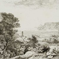 Ludwig Richter (1803 Dresden – 1884 ebd.), Bewaldete Apenninenlandschaft mit Turmruine, 1830, Radierung
