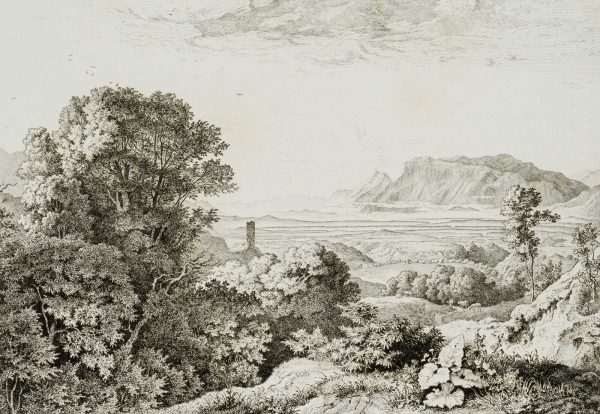 Ludwig Richter (1803 Dresden – 1884 ibid.), Wooded Apennine landscape with tower ruin, 1830, Etching