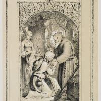 - Description: A pious pilgrim kneels before a monk or hermit in a forest. On the left another lady. Scene framed in ornate frames of late Gothic architecture and plant ornaments.