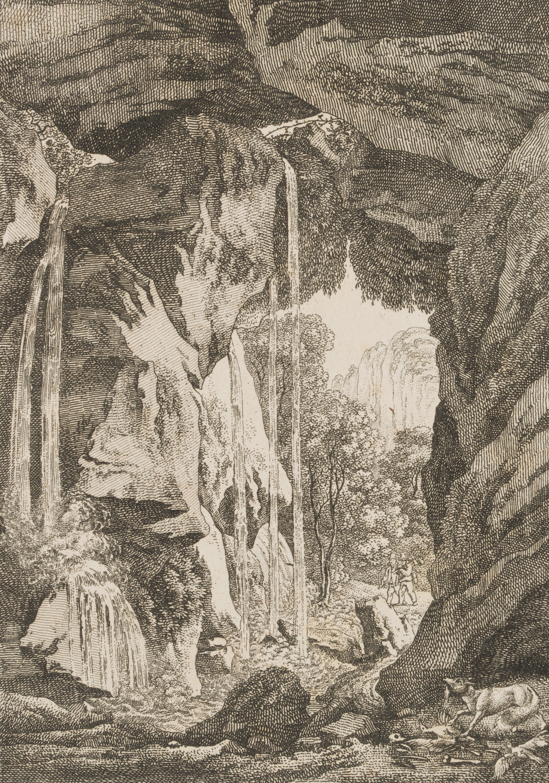 Ludwig Richter (1803 Dresden – 1884 ebd.), ‘Der Amselfall’. Blick aus der Höhle mit Wasserfall, 1820, Radierung