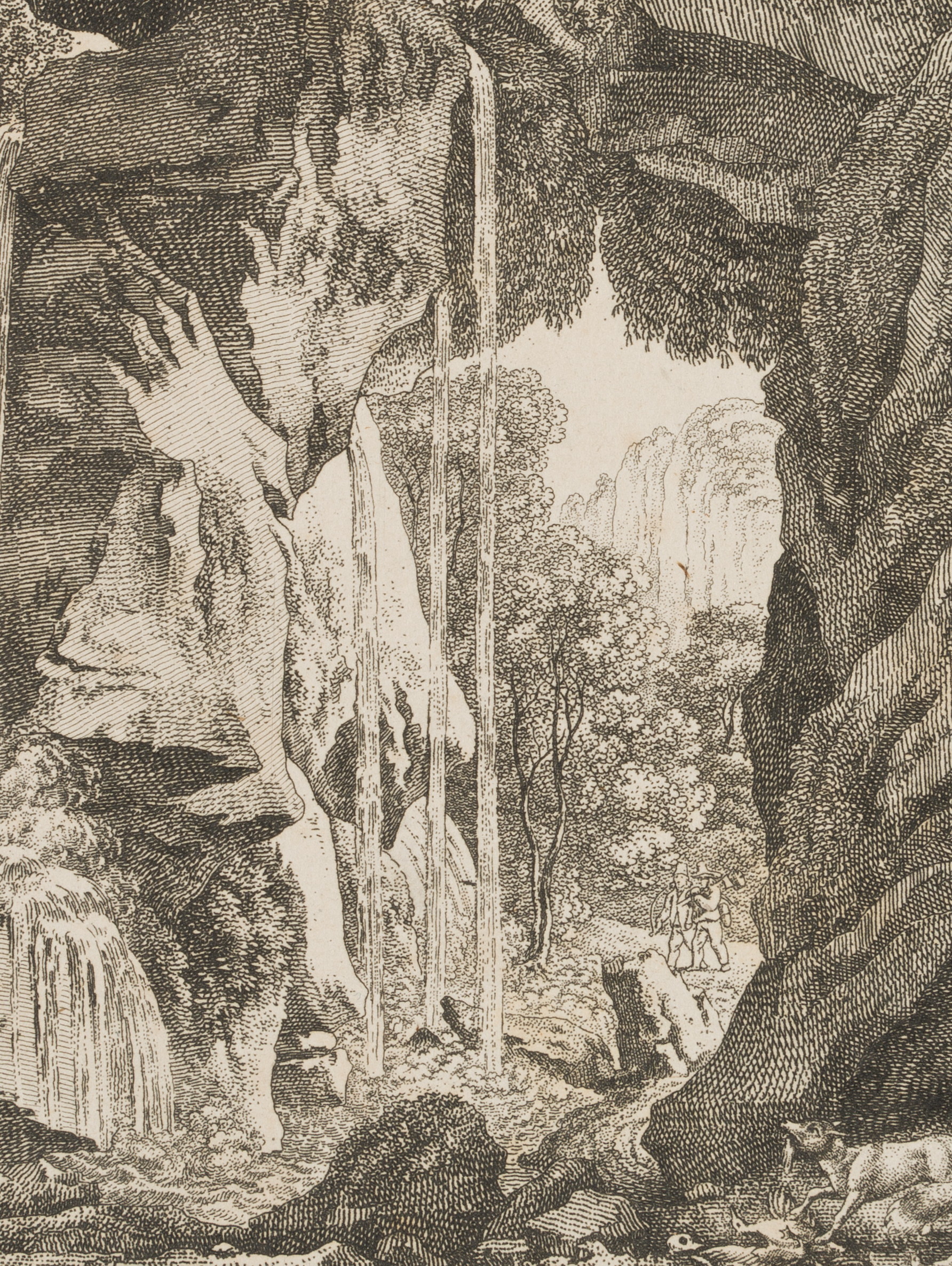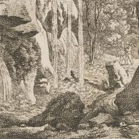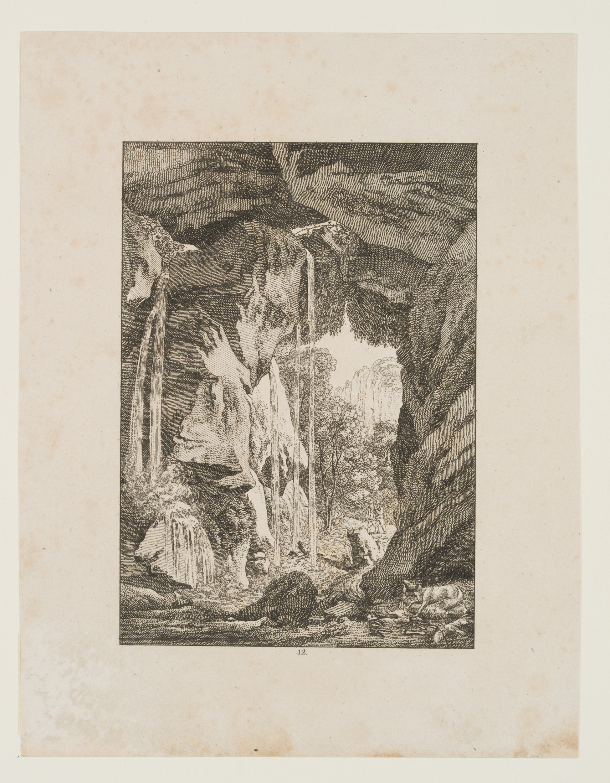 - Description: View from the rock cave with the Grünbach, whose water flows down over the boulders. In the foreground on the right, a fox tears up two birds. In the middle ground, two woodcutters are approaching the waterfall. The one on the right has his axe shouldered.
