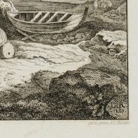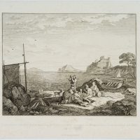 - Description: View of the bay of Baia, on the Gulf of Naples, where a group of figures has gathered in the foreground to rest. Seated in a circle, the figures appear to be having a meal, a man drinking from a jug. A wooden boat and a fishing net at the left edge of the picture identify the figures as fishermen and turn the scene into a sparse genre representation.