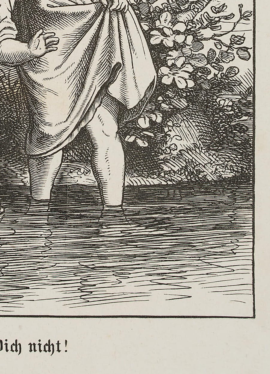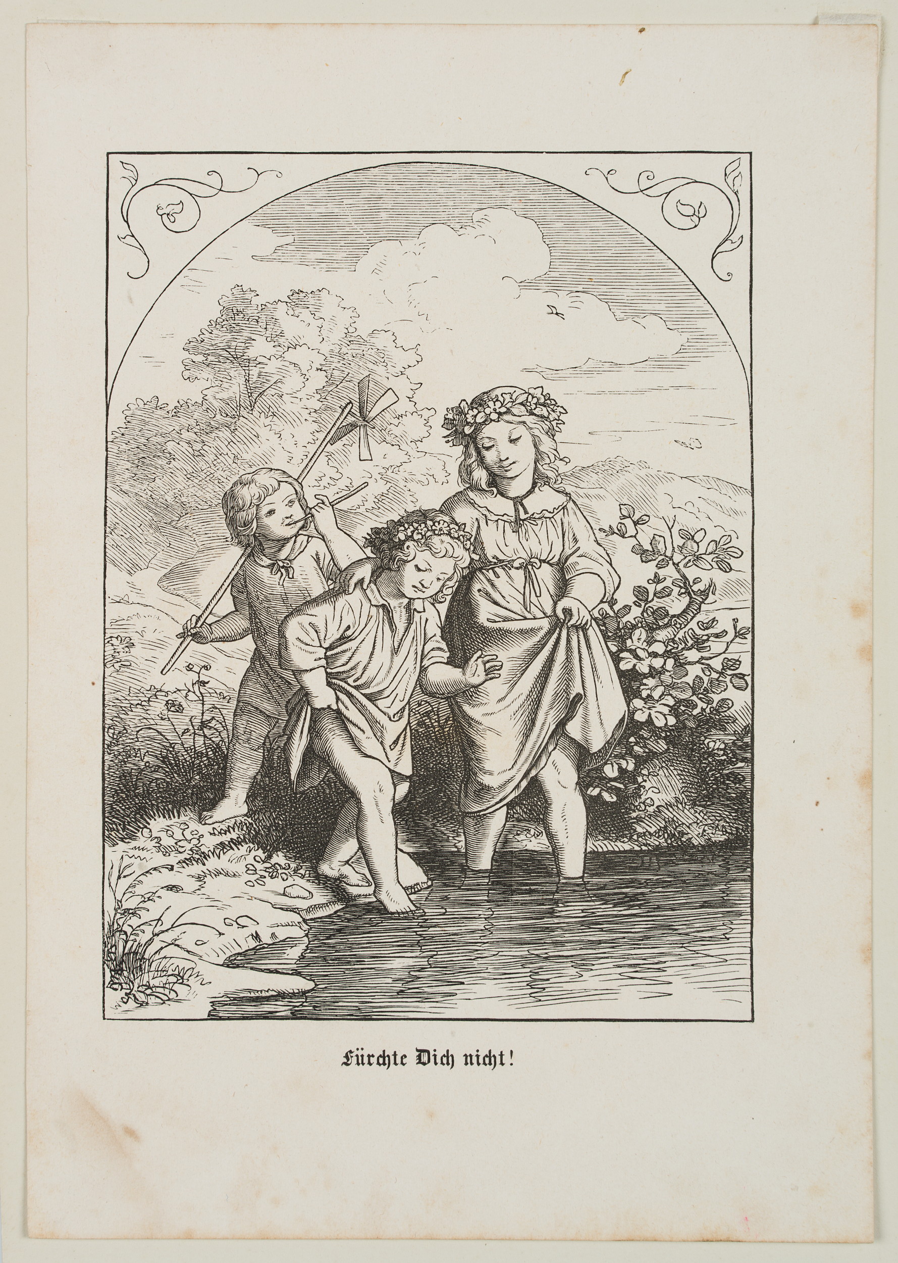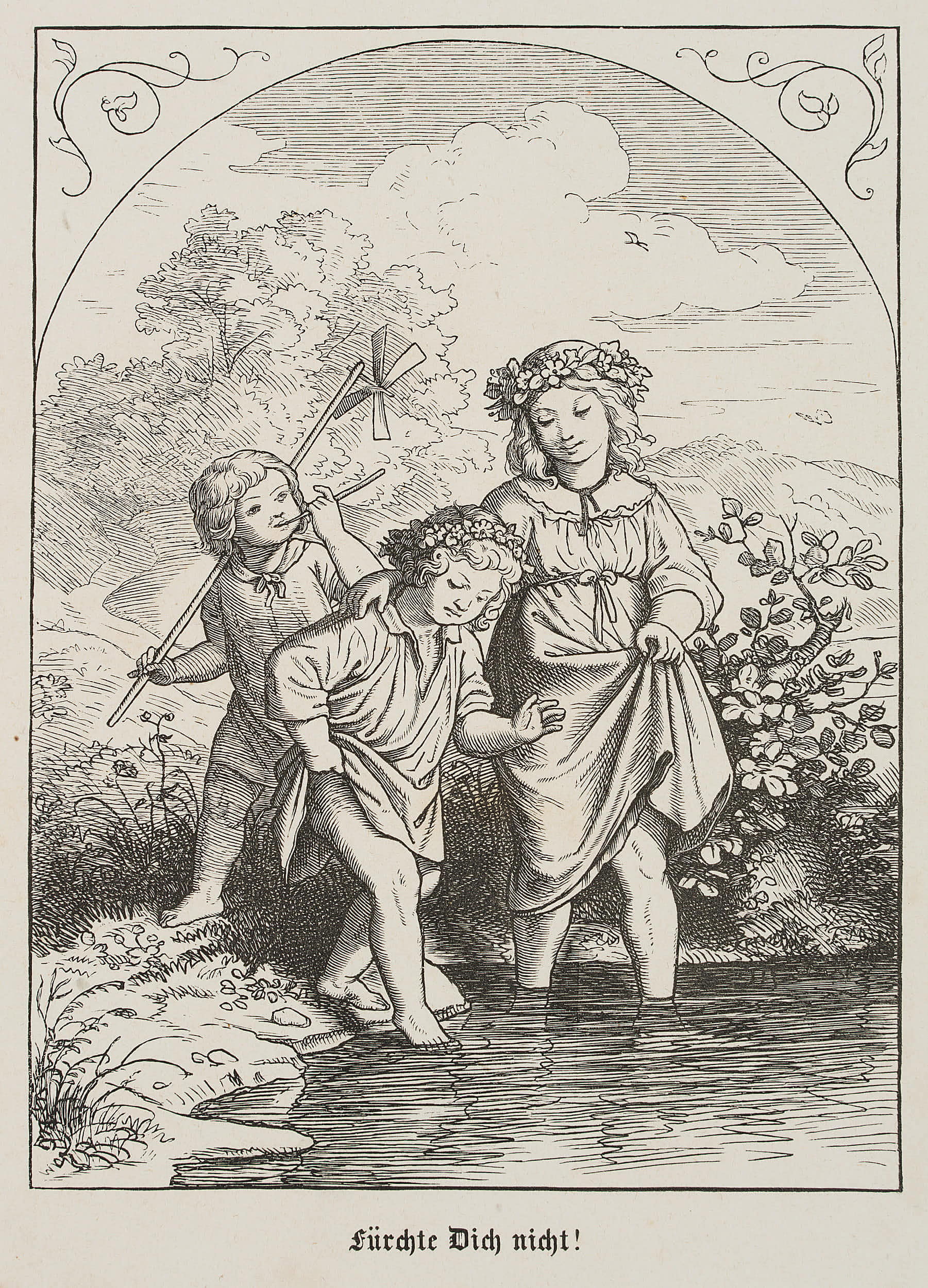 Ludwig Richter (1803 Dresden – 1884 ebd.), Fürchte Dich nicht! Spielende Kinder am Wasser, 1858, Holzstich