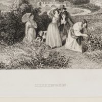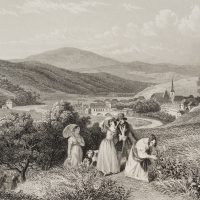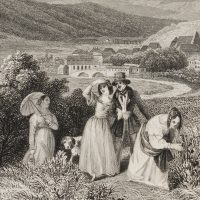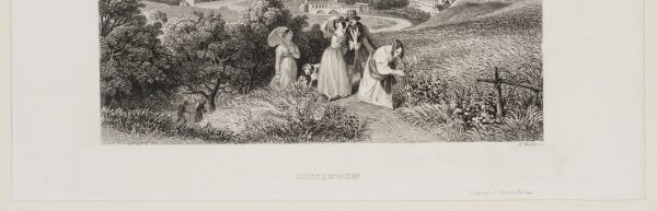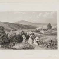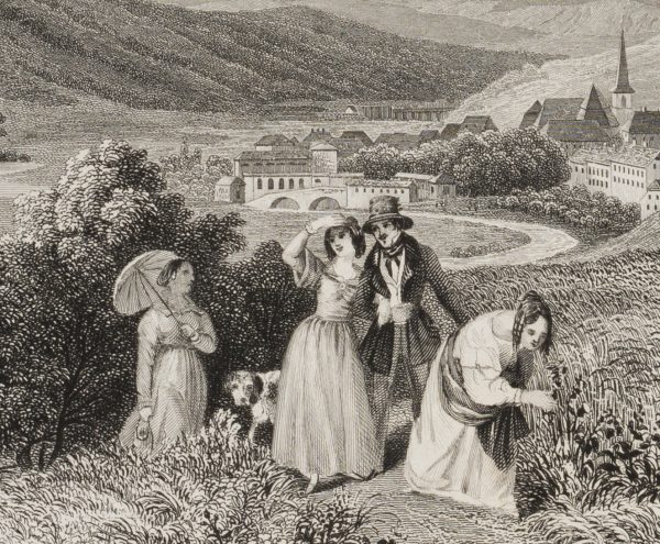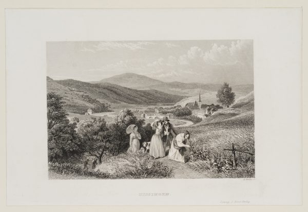 Ludwig Richter (1803 Dresden – 1884 ibid.), Panoramic view over hills and meadows and the town of Kissingen in the distance with elegant strollers on a Sunday outing, c. 1840, Steel engraving