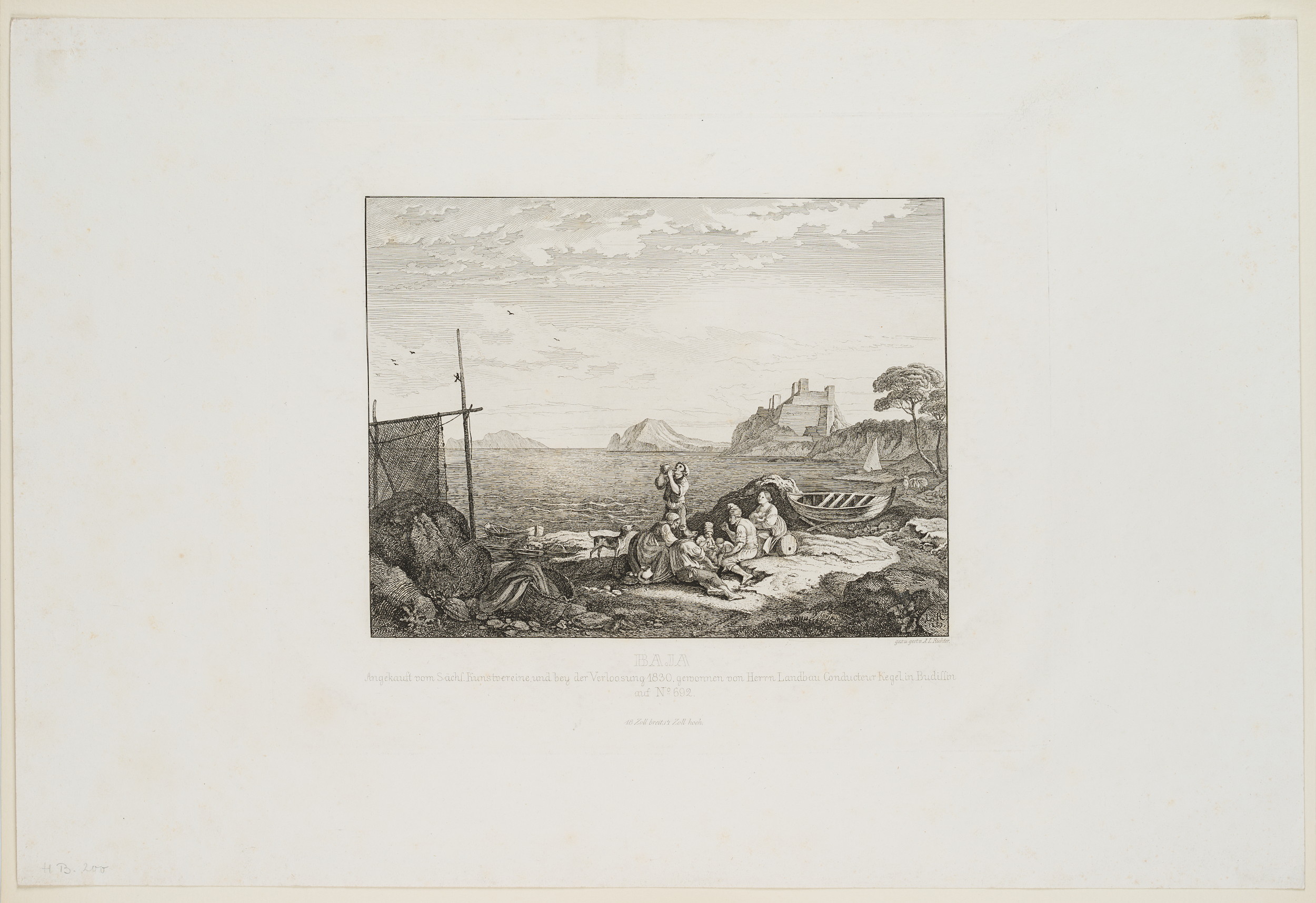 - Bezeichnung: Unten rechts im Druck signiert: “gez. u. gest. v. A. L. Richter”. Unten im Druck bezeichnet: “Baja / Angekauft vom Sächs. Kunstvereine und bey der Verloosung 1830 gewonnen von Herrn Landbau Conducteur Kegel in Budissin auf No. 692”.