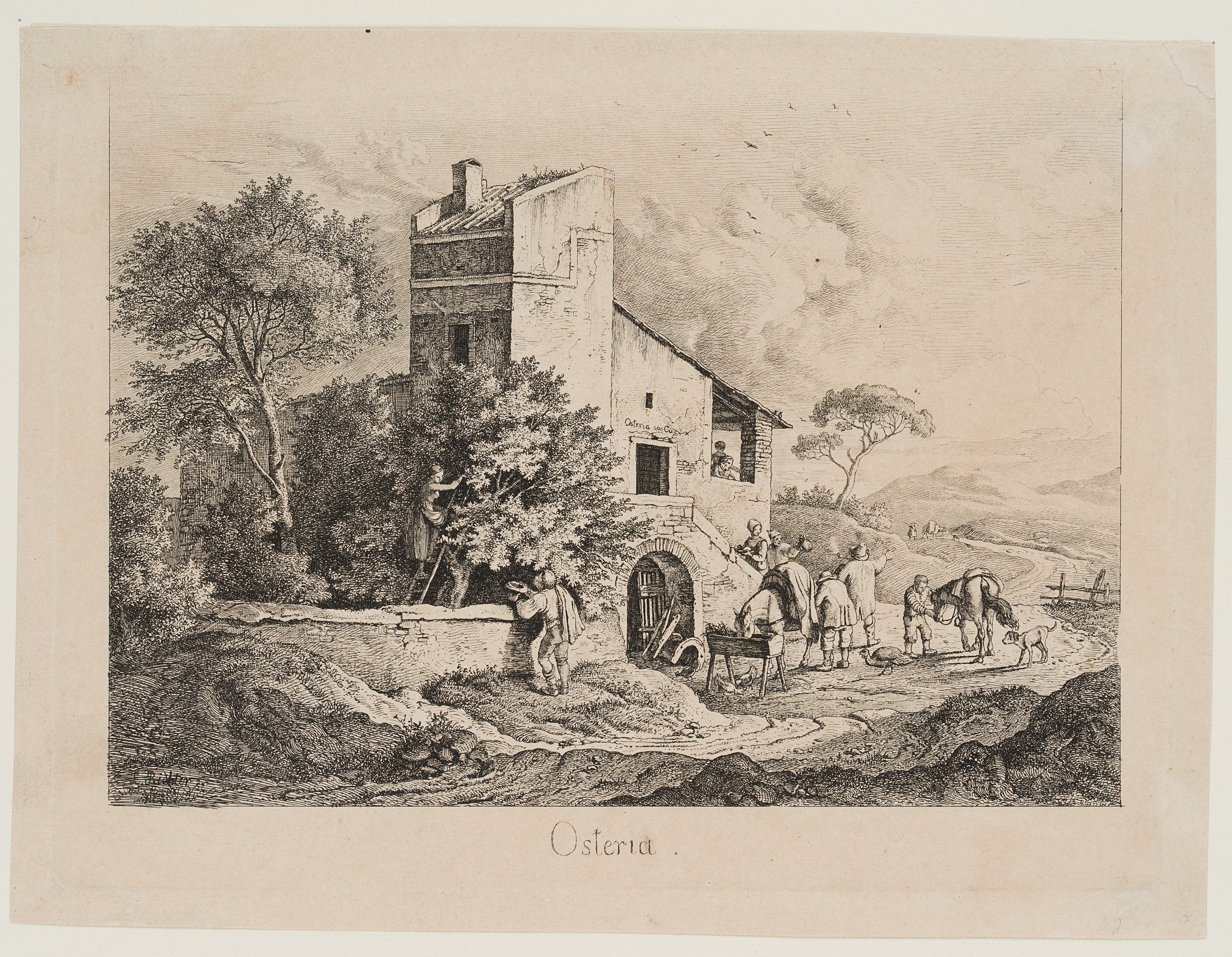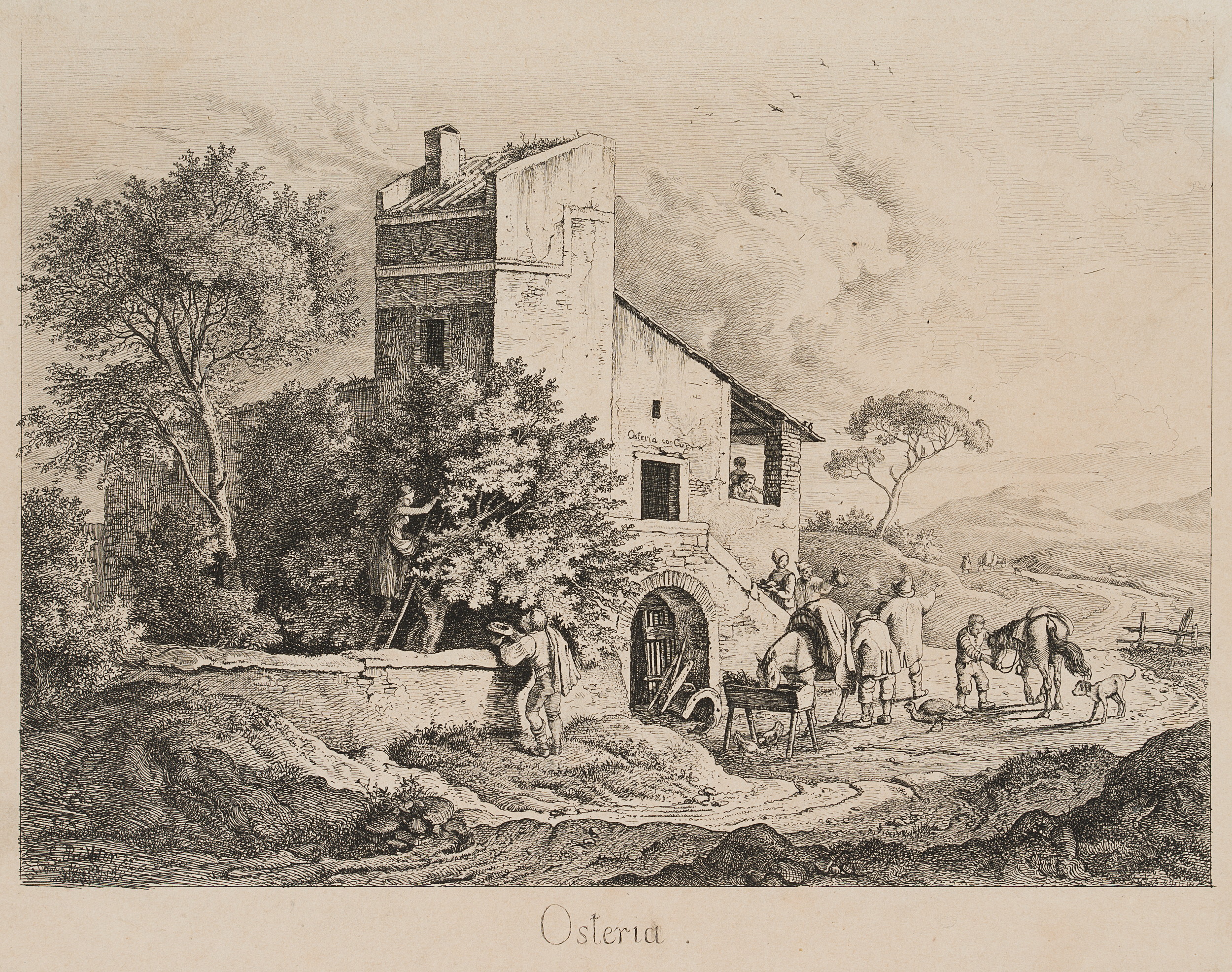 - Description: Rustic inn at a landscape in the surroundings of Rome. In front of it some figures in traditional costumes typical for the time and place.