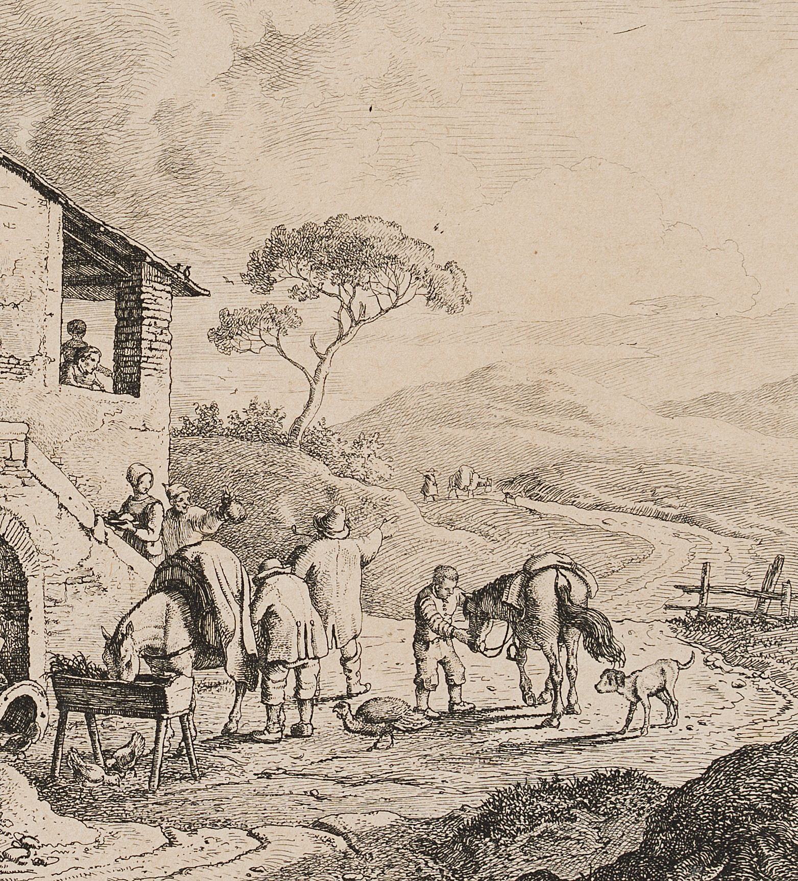 Ludwig Richter (1803 Dresden – 1884 ebd.), Osteria an italienischer Landstraße miut Figuren, 1832, Radierung
