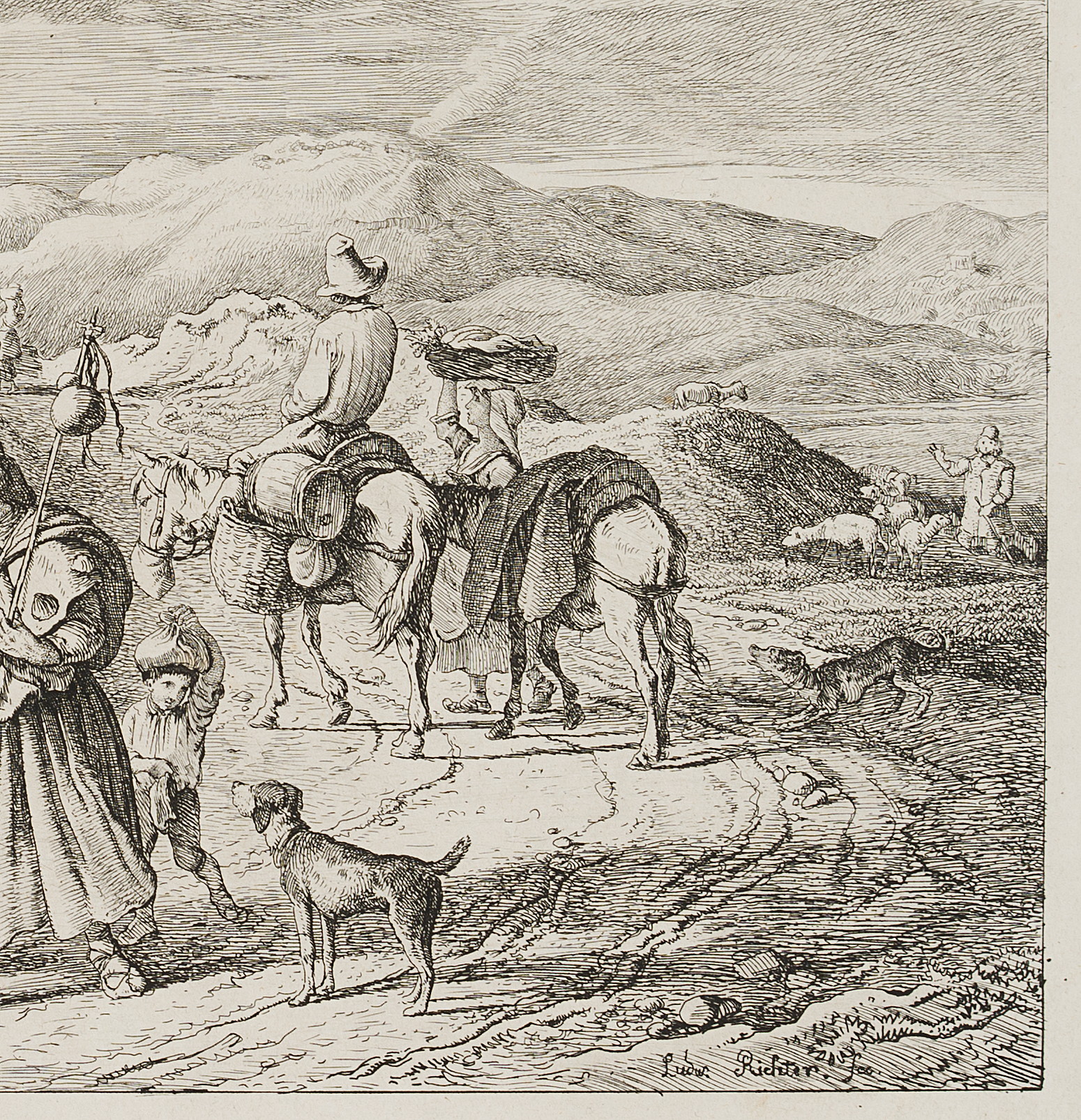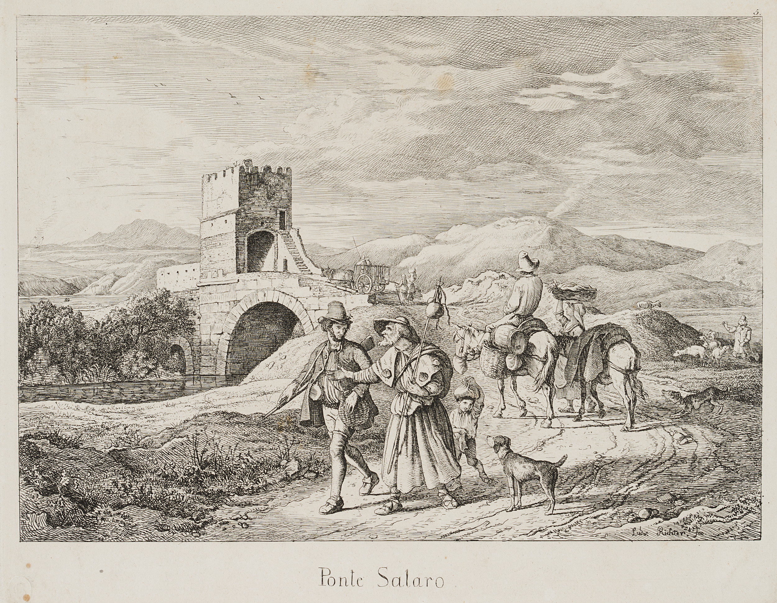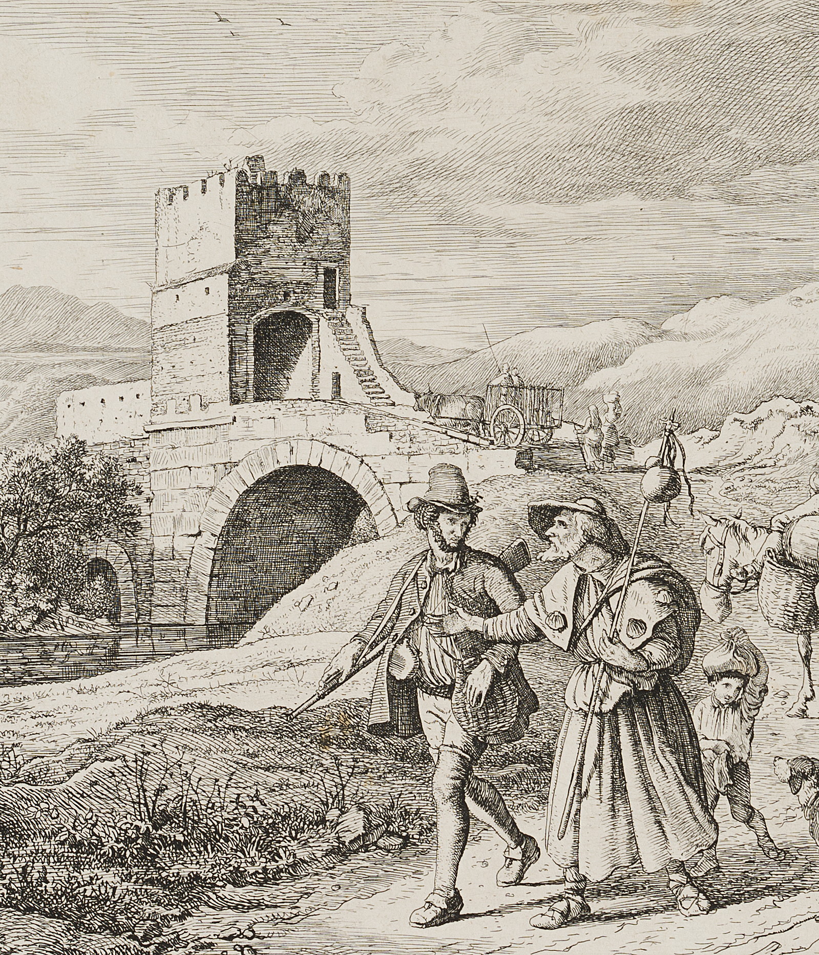 Ludwig Richter (1803 Dresden – 1884 ibid.), Ponte Salaro near Rome wandering figures and pilgrims, 1832, Etching