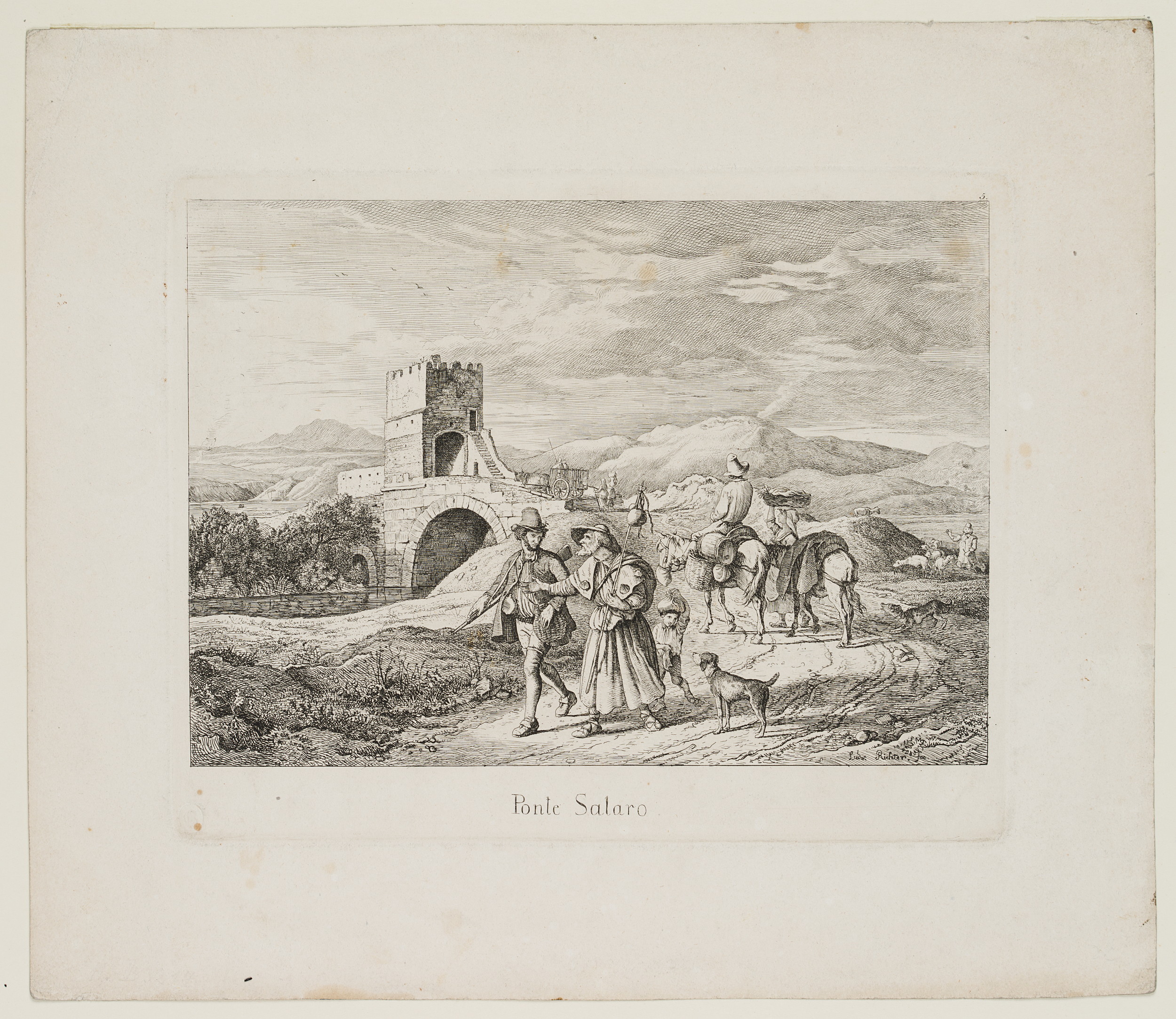 Ludwig Richter (1803 Dresden – 1884 ebd.), Ponte Salaro bei Rom wandernden Figuren und Pilger, 1832, Radierung