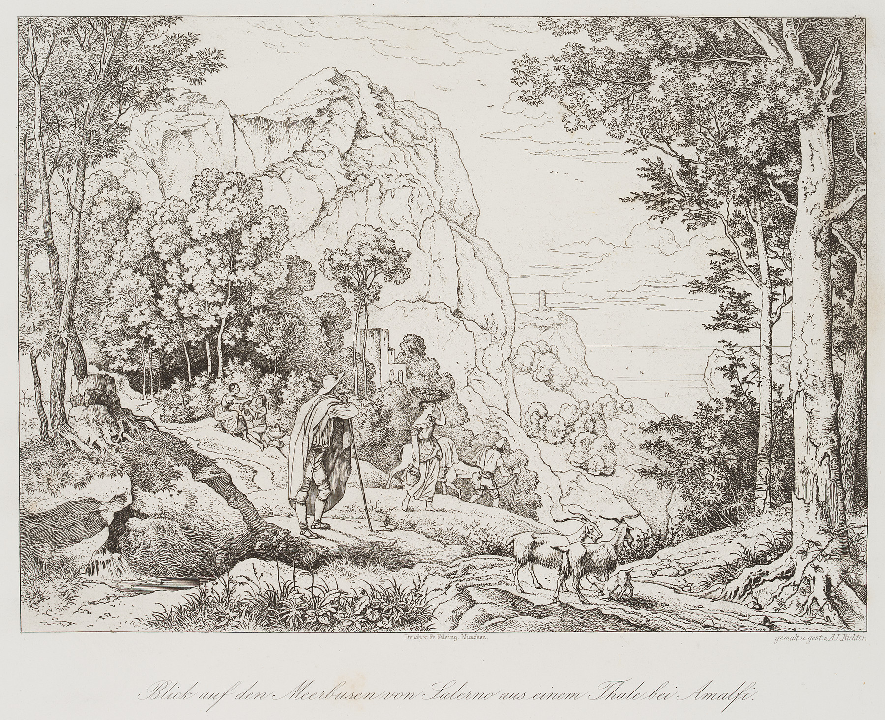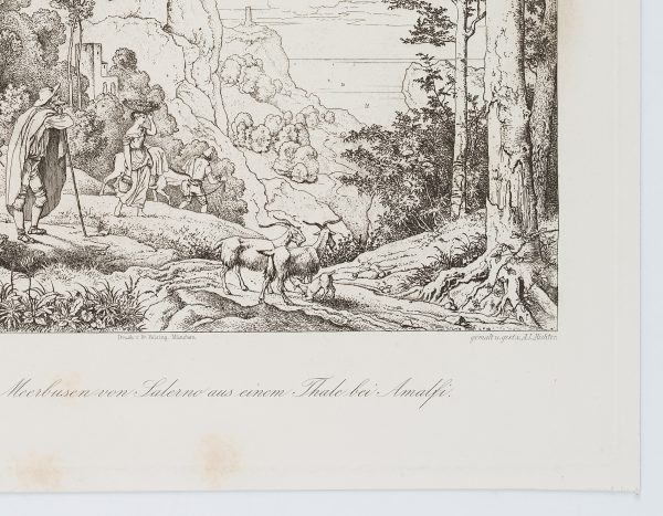 - Inscription: Lower middle signed: “”gemalt u. gest. v. A.L.Richter | Blick auf den Meerbusen von Salerno aus einem Thale bei Amalfi””.
