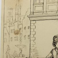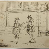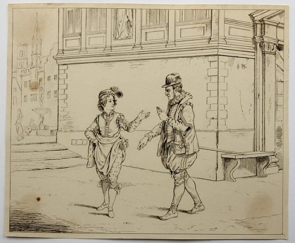 - Beschreibung: Illustration für zweiten Aufzug, zweite Szene. Darstellung des Malvolio und Viola in einer Straßenszene. In der Darstellung in Druckplatte monogrammiert.