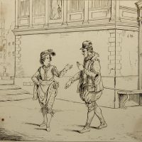 - Description: Illustration for the second act, second scene. Depiction of Malvolio and Viola in a street scene. Monogrammed in the illustration in printing plate.