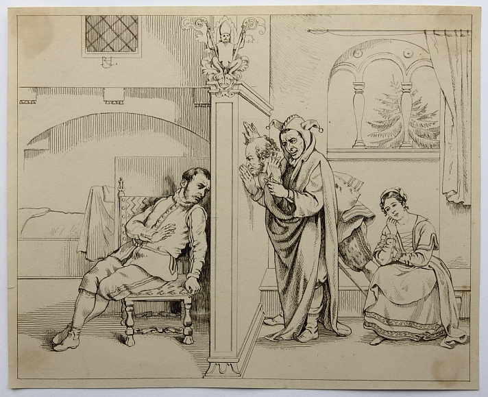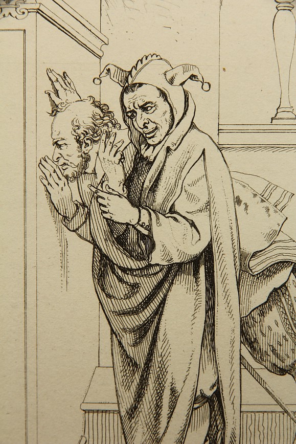 - Beschreibung: Illustration für vierten Aufzug, zweite Szene. Der Narr spricht zum eingekerkerten Malvolio. In der Darstellung in Druckplatte monogrammiert.