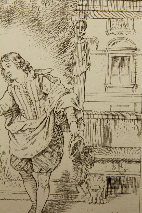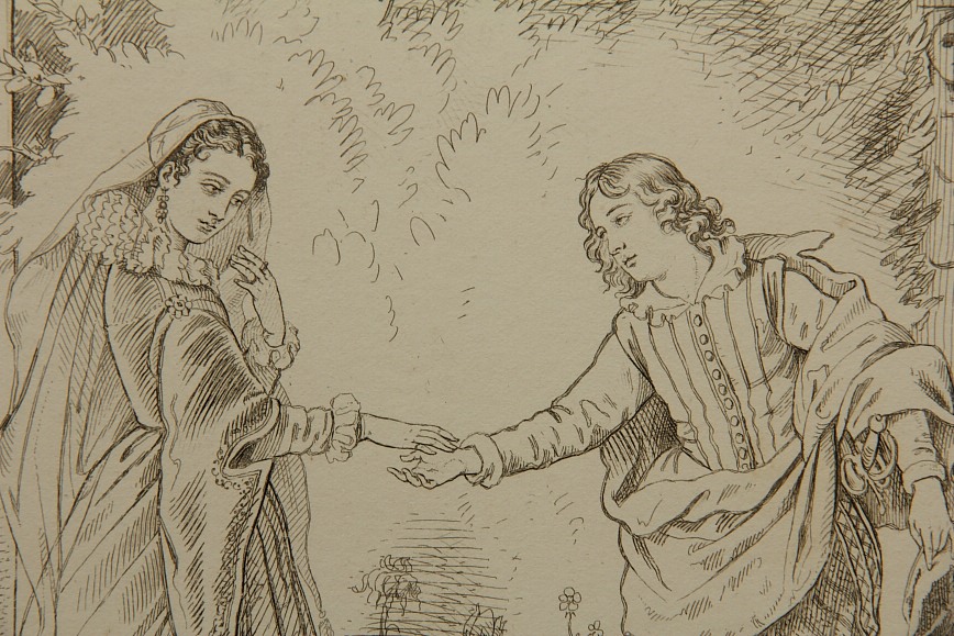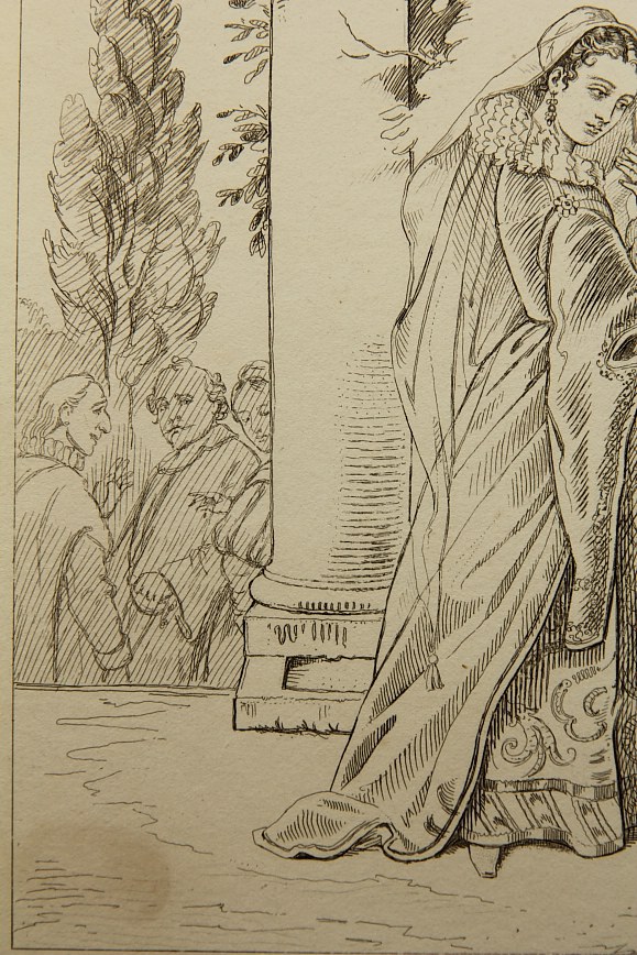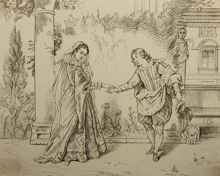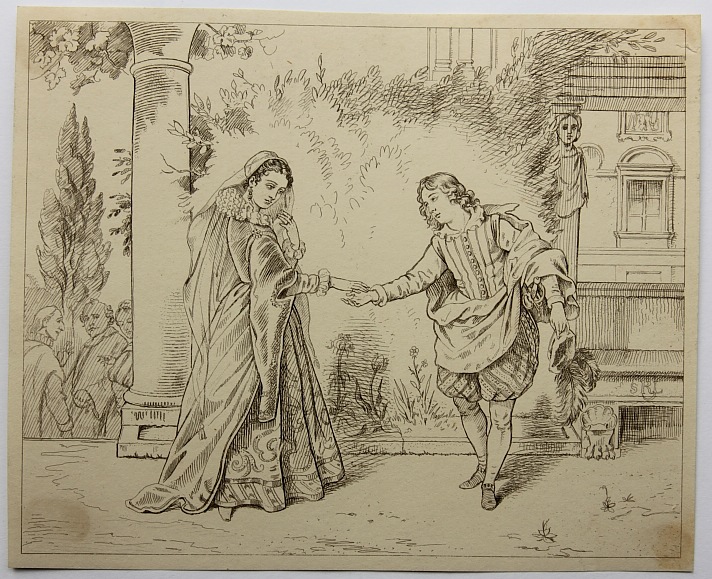 - Beschreibung: Illustration für dritten Aufzug, erste Szene. Darstellung der Olivia und des Viola im Garten. In der Darstellung in Druckplatte monogrammiert.