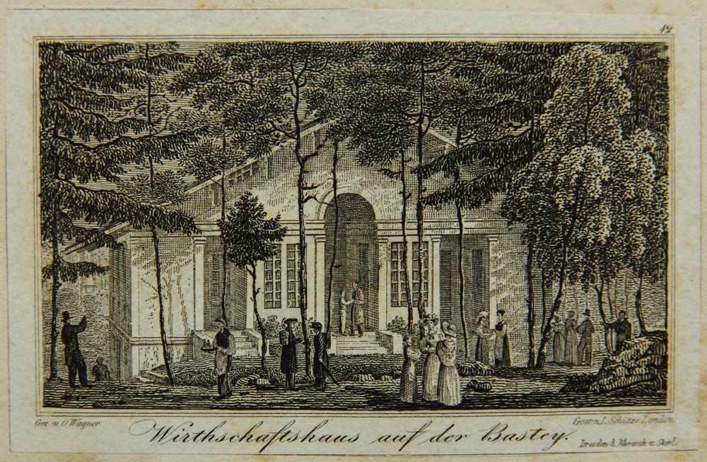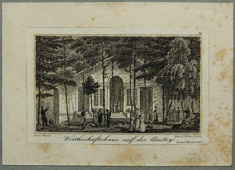 Ludwig Schütze (*um 1807 Dresden), Wirtschaftshaus Bastei im Elbsandsteingebirge, 19. Jahrhundert, Kupferstich