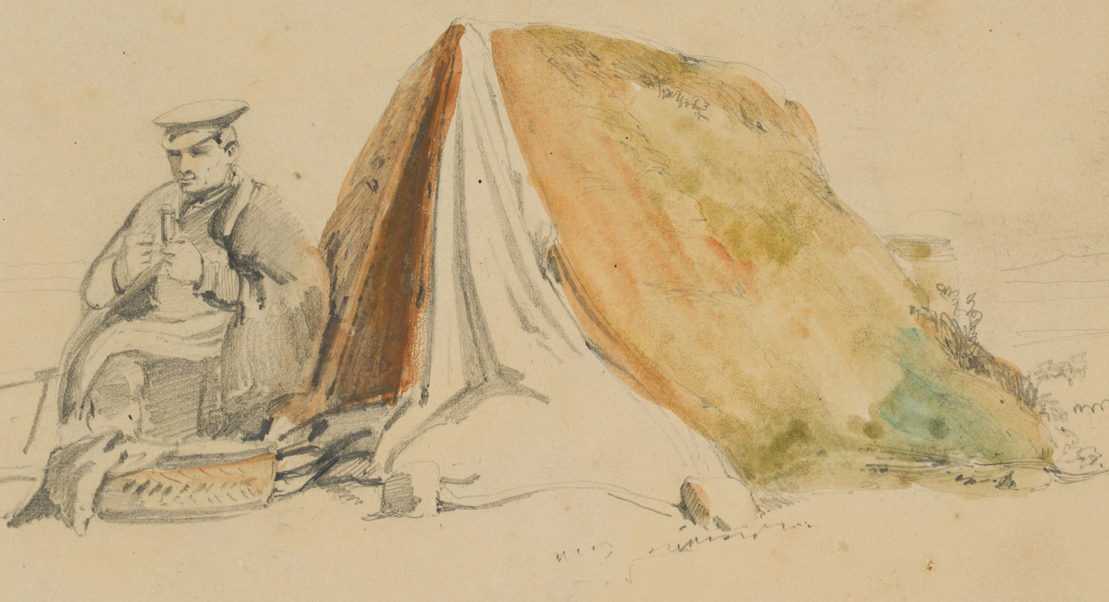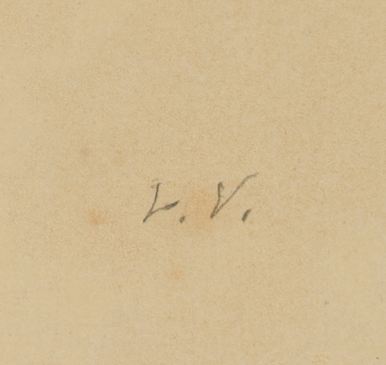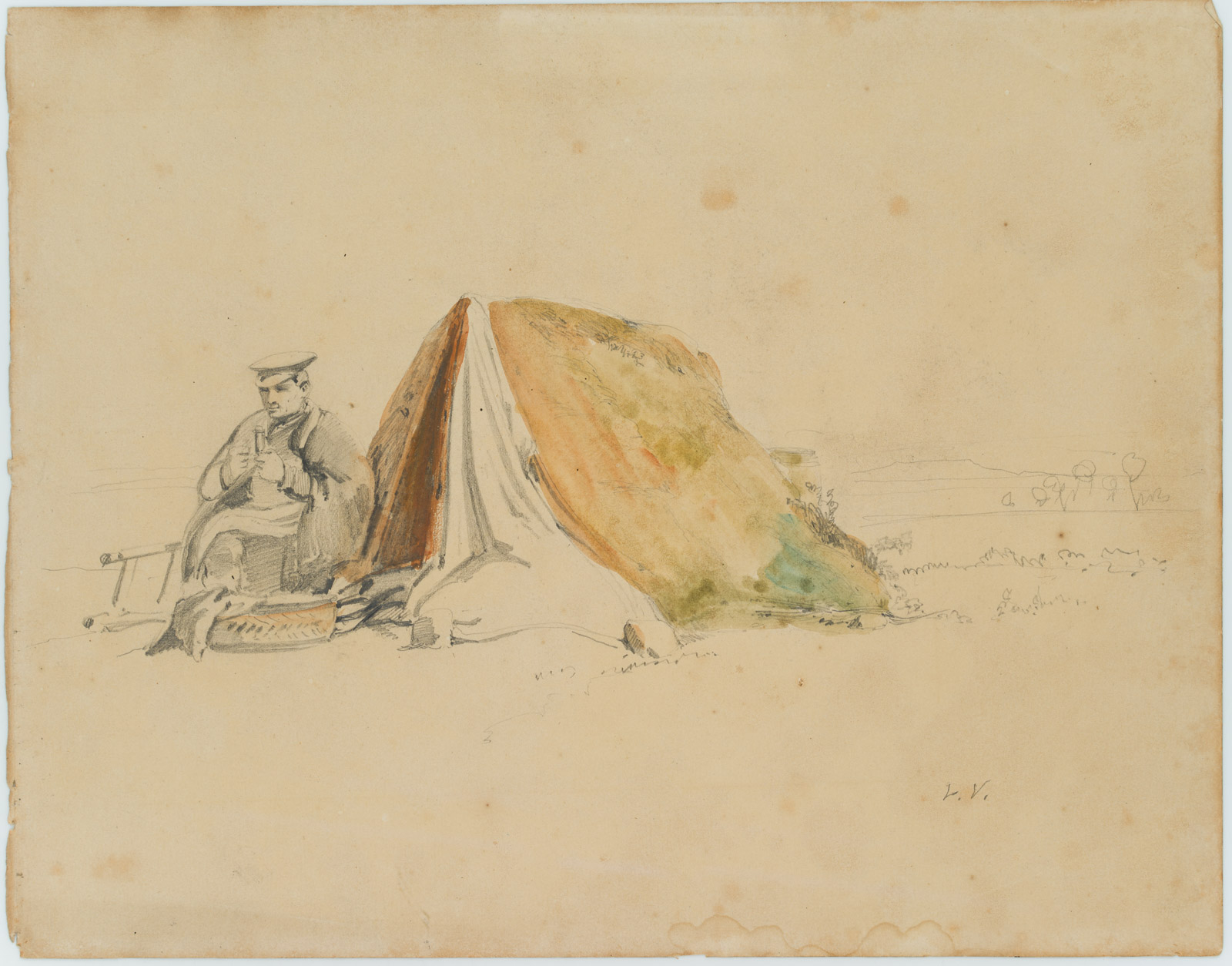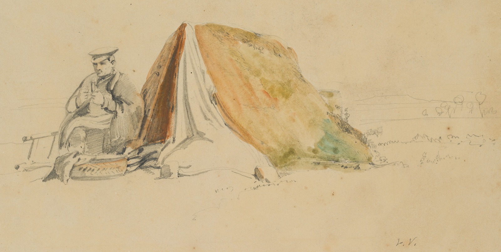 - Beschreibung: Bezeichnet unten rechts in der Darstellung “L.V.”. Vor einem kleinen, scheinbar improvisierten Zelt, erblicken die Betrachtenden einen Mann, der sich in eine wärmende Decke gehüllt hat. Eine Mütze auf dem Kopf, hält er in seinen Händen ein Pfeife oder ähnliches und blickt abwesend ins Leere. Vor ihm liegen allerlei Utensilien, darunter eine Leiter, eine Reifen und weitere Decken. Im Hintergrund ist schemenhaft eine Landschaft dargestellt.