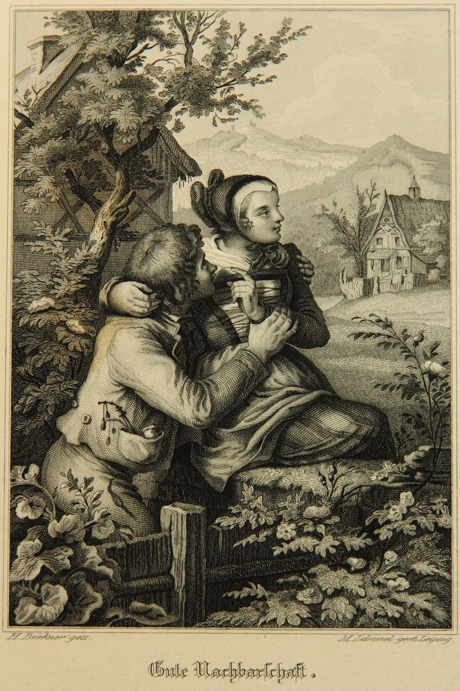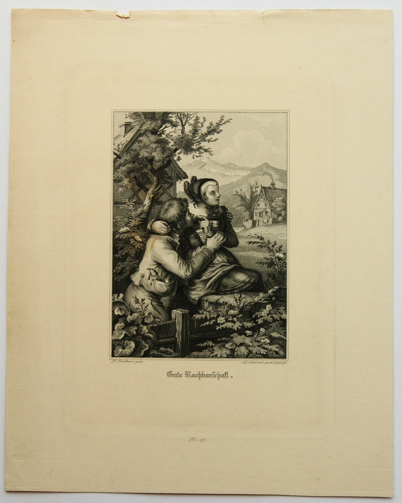 Martin Moritz Lämmel (born 1849 Kulkwitz) after Hugo Bürkner (1818 Dessau – 1897 Dresden), “Good Neighbour”, Young Lovers, 19th century, Steel engraving