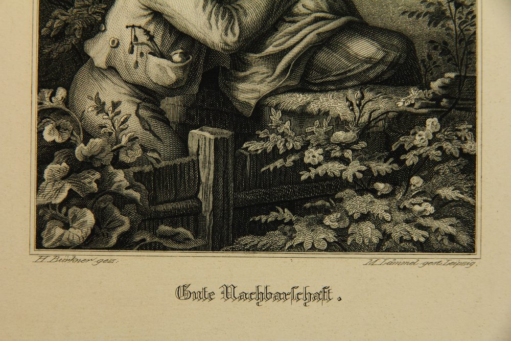 Martin Moritz Lämmel (*1849 Kulkwitz) nach Hugo Bürkner (1818 Dessau – 1897 Dresden), “Gute Nachbarschaft”, Junges Liebespaar, 19. Jahrhundert, Stahlstich
