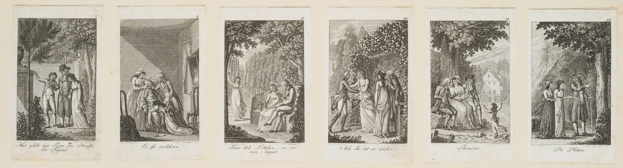 Paul Jakob Laminit (1773 Augsburg – 1831 ibid.) after Thomas Weber (1761 Augsburg – 1828 ibid.), 12-part series of military scenes and genre scenes from the life of the bourgeoisie, c. 1799, Etching