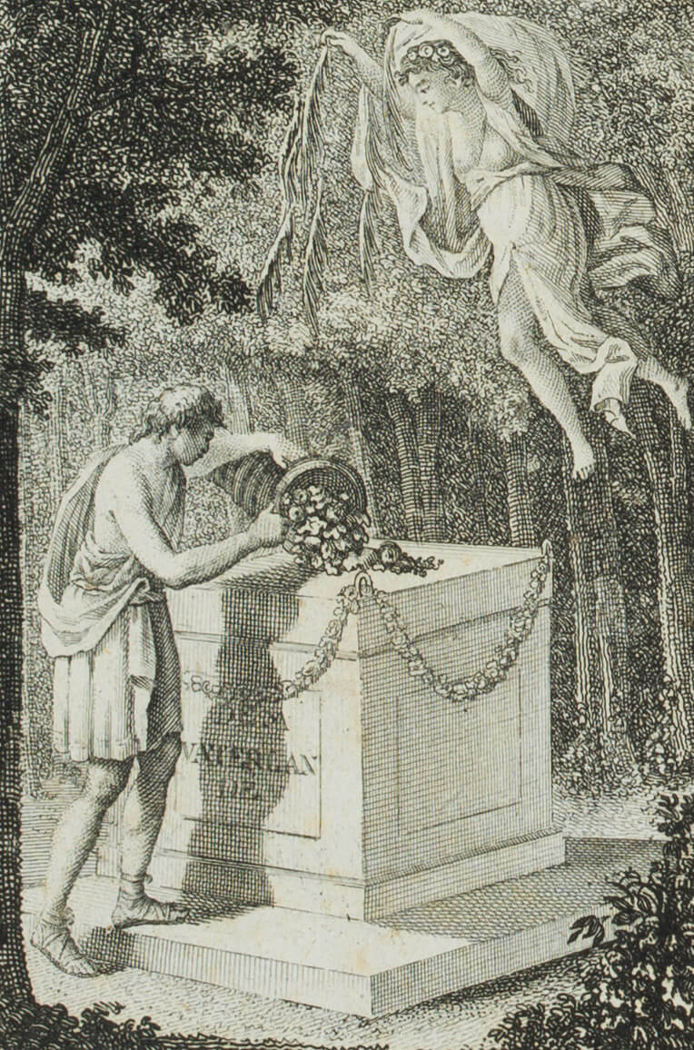 - Beschreibung: Mit Allegorien und Engeln vor Gedenksteinen und antiker Tempelarchitektur