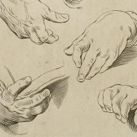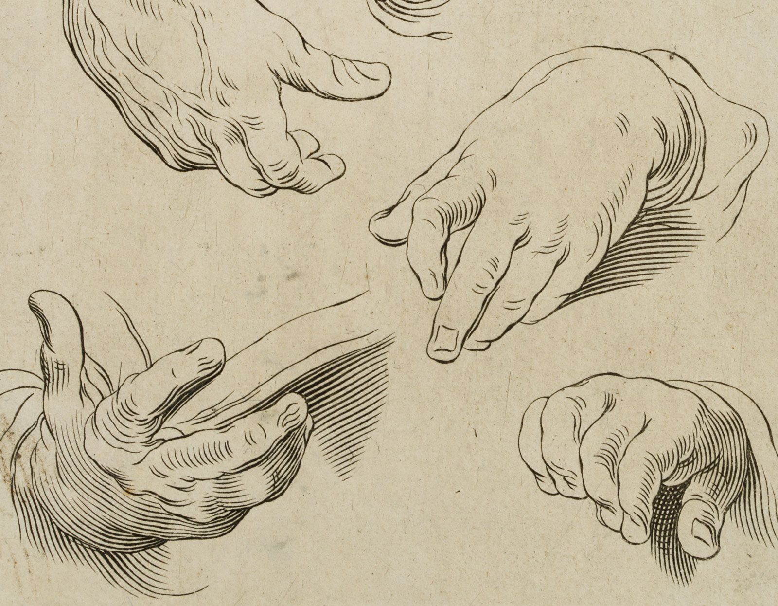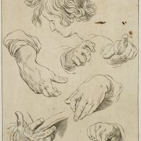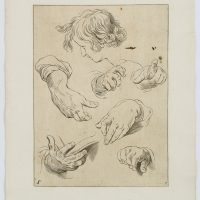 - Beschreibung: Das Blatt zeigt Studien von Händen und Fingern in verschiedenen Perspektiven und Haltungen, sowie einen Kopf im verlorenen Profil. Entspricht Blatt 3 aus der Folge “Fondamenten der Teecken-Konst aerdigh geinverteert door Abraham Bloemaert”, eine Sammlung von Studienskizzen menschlicher Gesichter, Körperformen, -gliedern und -haltungen.