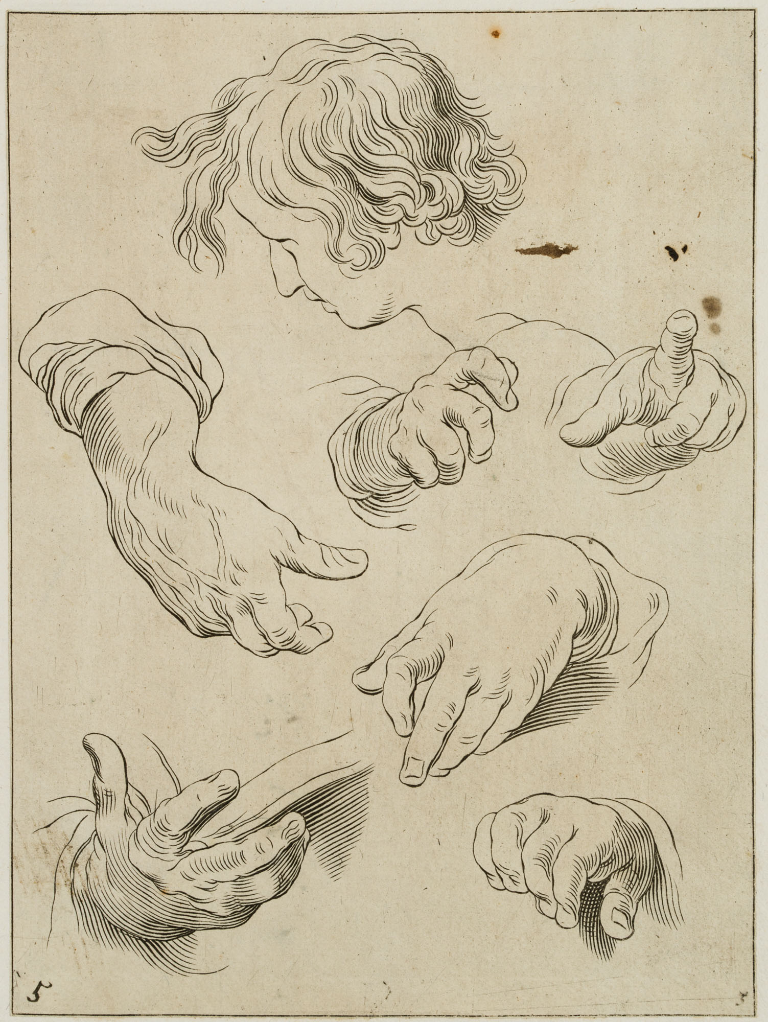 - Description: The sheet shows studies of hands and fingers in various perspectives and postures, as well as a head in lost profile. Corresponds to sheet 3 from the series “Fondamenten der Teecken-Konst aerdigh geinverteert door Abraham Bloemaert”, a collection of study sketches of human faces, body forms, limbs and postures.