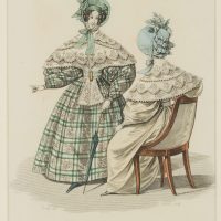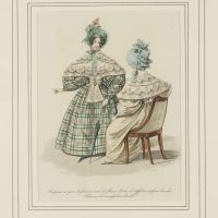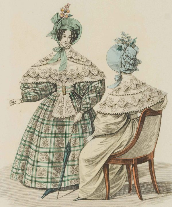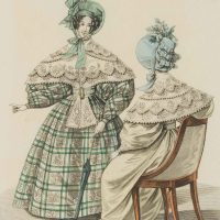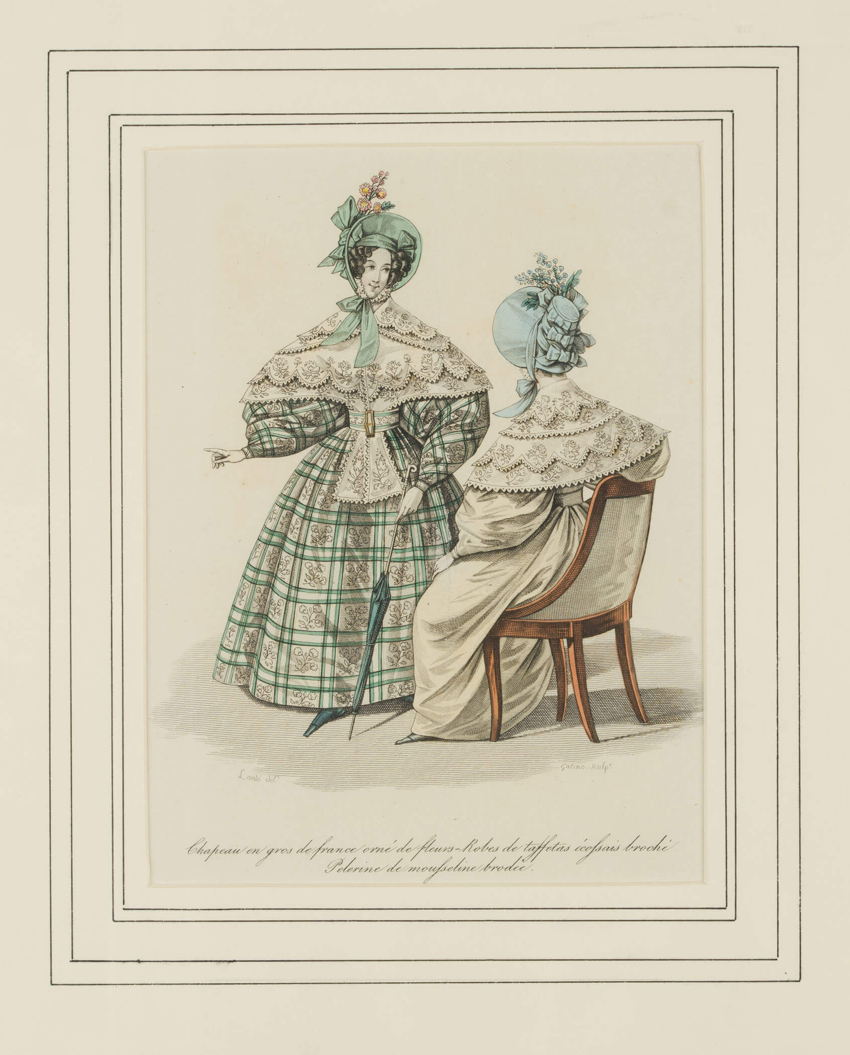 Louis-Marie Lante (1789 Paris – 1871 Fontainebleau) nach Georges Jacques Gatine (19. Jahrhundert), Elegante Garderobe mit Haube und kariertem Kleid, um 1830, Federlithographie