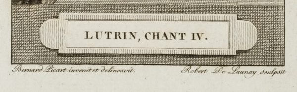 - Bezeichnung: Unten links signiert mit: “Bernard Picart invenit et delineavit”, daneben signiert mit “Robert De Launay sculpsit.”. In der Graphik bezeichnet mit “LUTRIN, CHANT IV.”.