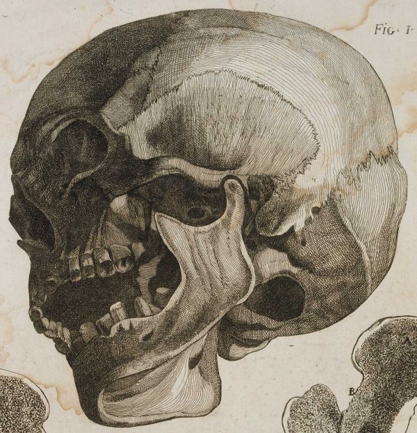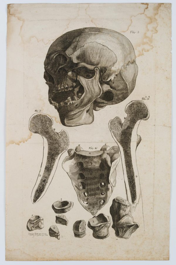Jacques Lavallée (19th century) after Jacques Gamelin (1738 Carcassonne, Aude – 1803 ibid.), Anatomical skeletal studies, skull, sacrum, hip bones, from the anatomical table work ‘Nouveau recueil d’ostéologie et de myologie’ (A New Collection of Bones and Muscles) from 1779, 1778, Copper engraving