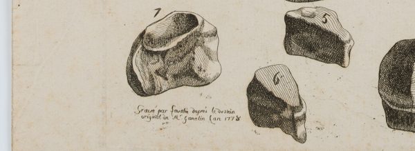 - Beschreibung: Die verschiedenen Knochenteile sind mit einer Nummerierung versehen, links unten in der Druckplatte signiert und datiert. “Gravé par Lavalée daprés le Dessin original de M. Gamelin an 1778”. Jacques GAMELIN war ein französischer Maler, Zeichner, Kupferstecher und Radierer des Frühklassizismus. Gamelin studierte zuerst an der Königlichen Akademie der Künste in Toulouse unter Jean-Pierre Rivalz. Weitere Stationen seiner künstlerischen Ausbildung waren Paris und Rom, wo er ab 1771 als Professor an der Accademia di San Luca tätig war. Ein Jahr später ernannte ihn Papst Clemens XIV. zum Hofmaler. In Rom lernte Gamelin auch den Maler Anton Raphael Mengs kennen. Das Blatt entstand im Zusammenhang mit dem anatomischen Tafelwerk ‘Nouveau recueil d’ostéologie et de myologie’