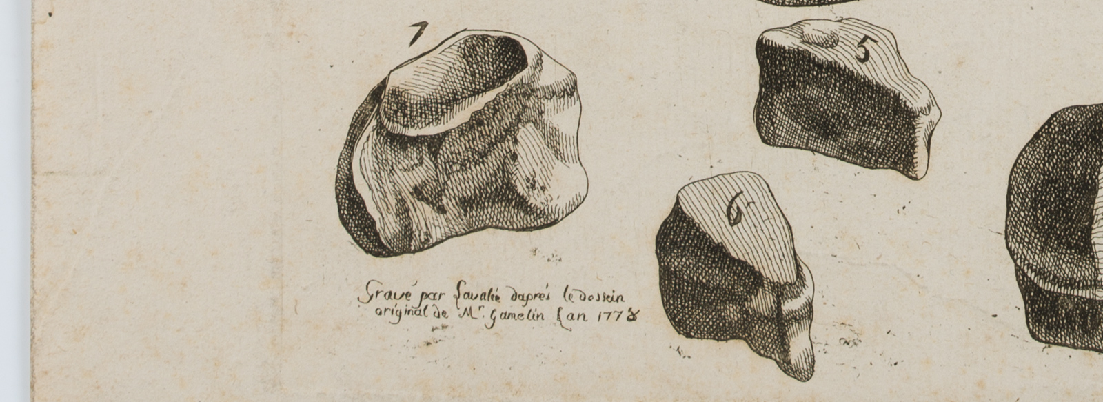 - Description: The various bone parts are numbered, signed and dated in the lower left corner of the printing plate. “Gravé par Lavalée daprés le Dessin original de M. Gamelin an 1778”. Jacques GAMELIN was a French painter, draughtsman, engraver and etcher of the early classicism. Gamelin first studied at the Royal Academy of Arts in Toulouse under Jean-Pierre Rivalz. Further stations of his artistic training were Paris and Rome, where he worked as a professor at the Accademia di San Luca from 1771. One year later, Pope Clement XIV appointed him court painter. In Rome Gamelin also met the painter Anton Raphael Mengs. The print was created in connection with the anatomical table work ‘Nouveau recueil d’ostéologie et de myologie’.
