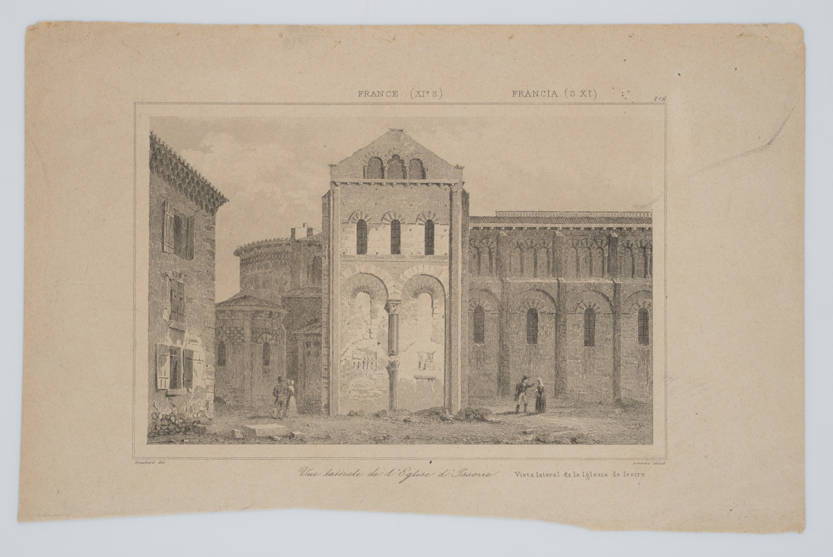 • Bezeichnung: Unten links signiert mit “Gaucherel del” und rechts mit “Lemaitre direxit”, darunter beschriftet mit “Vue latérale de l’Eglise d’Issoire”. Das Blatt trägt die Nummer “216”.