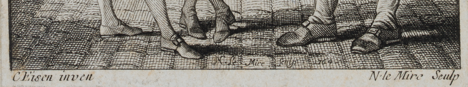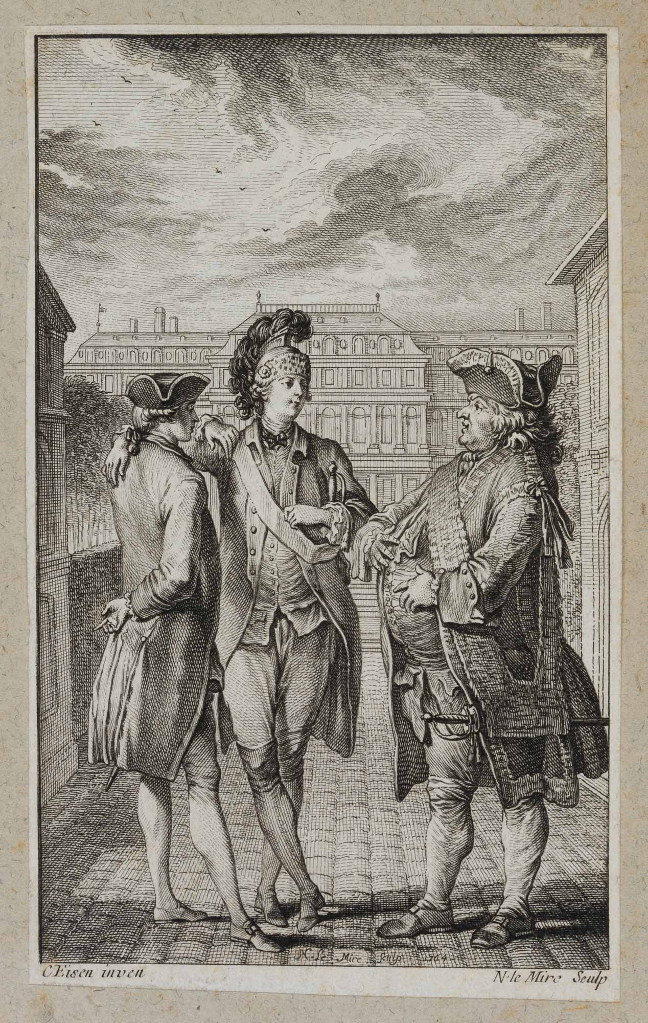 Aus der Hand des franz. Kupferstechers und Buchillustrators Lemire, der zu den bedeutendsten Stechern des 18. Jh.s zählt. Unter der Darstellung signiert “C.Eisen inven. / N. le Mire sculp.”, mittig unten in der Darstellung datiert “N. Le Mire sculp. 1764” verso mit Sammlungsstempel: Großherzogliches Museum zu Schwerin, Lugt-Nummer L.2273.Thieme-Becker XXIII, 27.