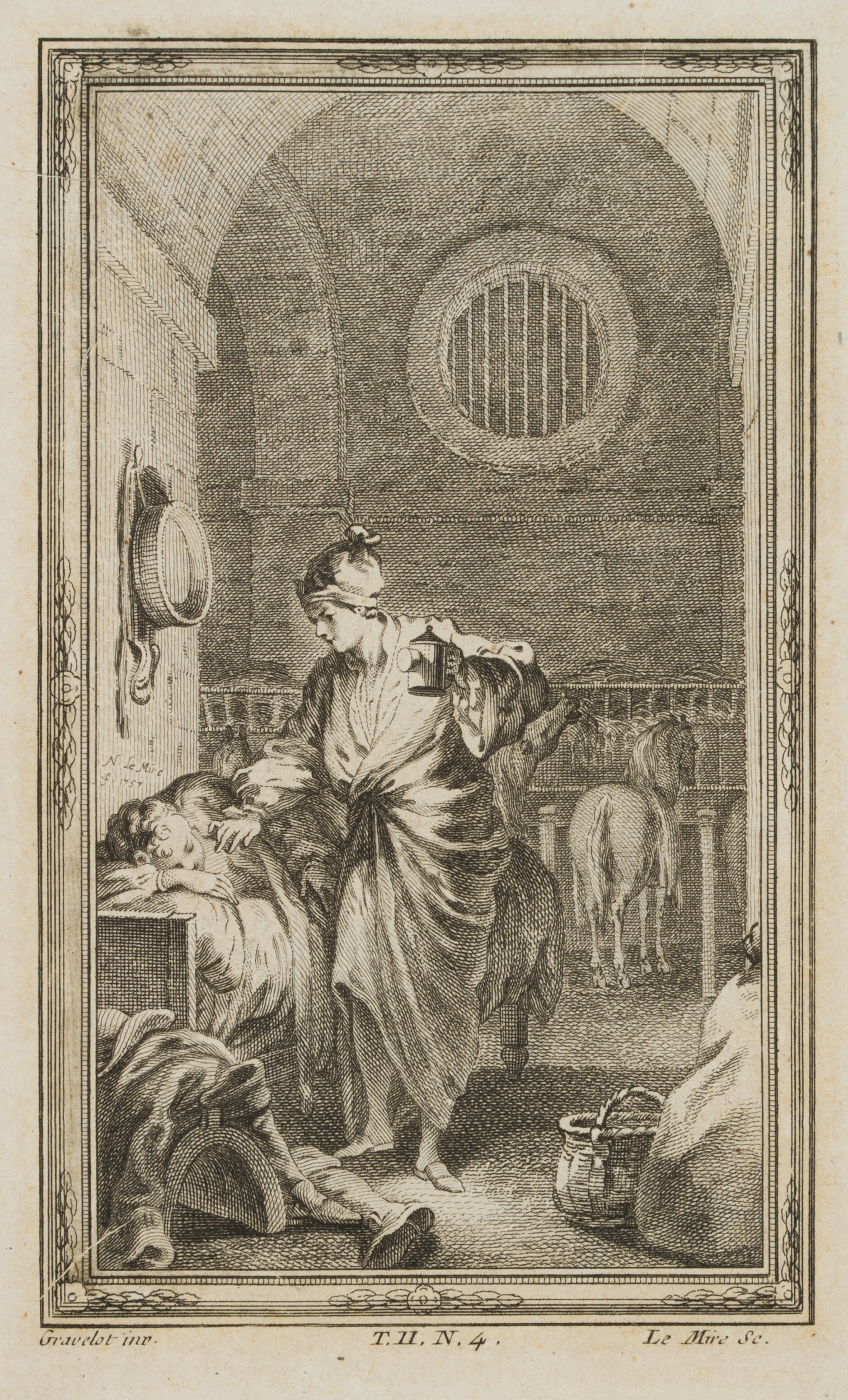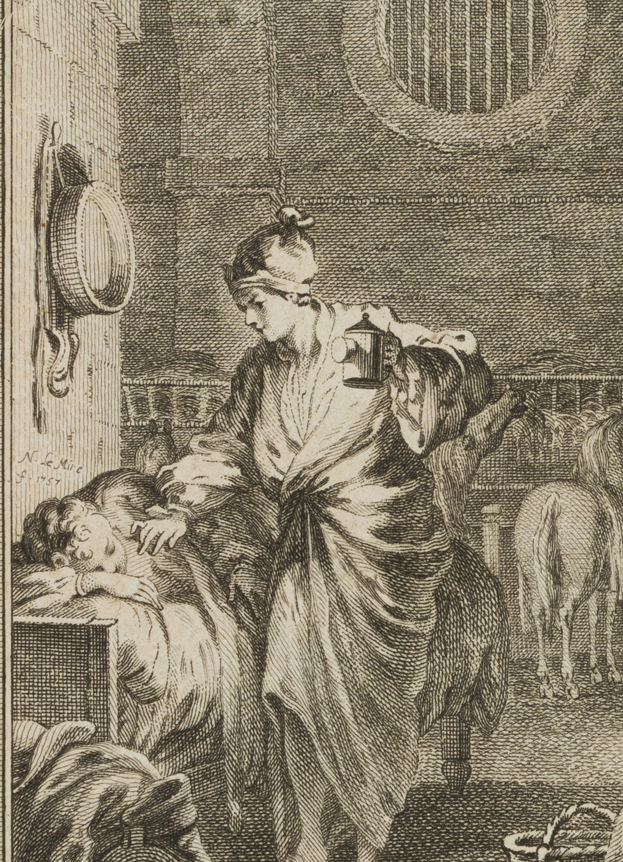 - Description: Literary illustration after a model by Gravelot. Still dressed for night, a lady stands in the horse stable and wakes a sleeping servant.