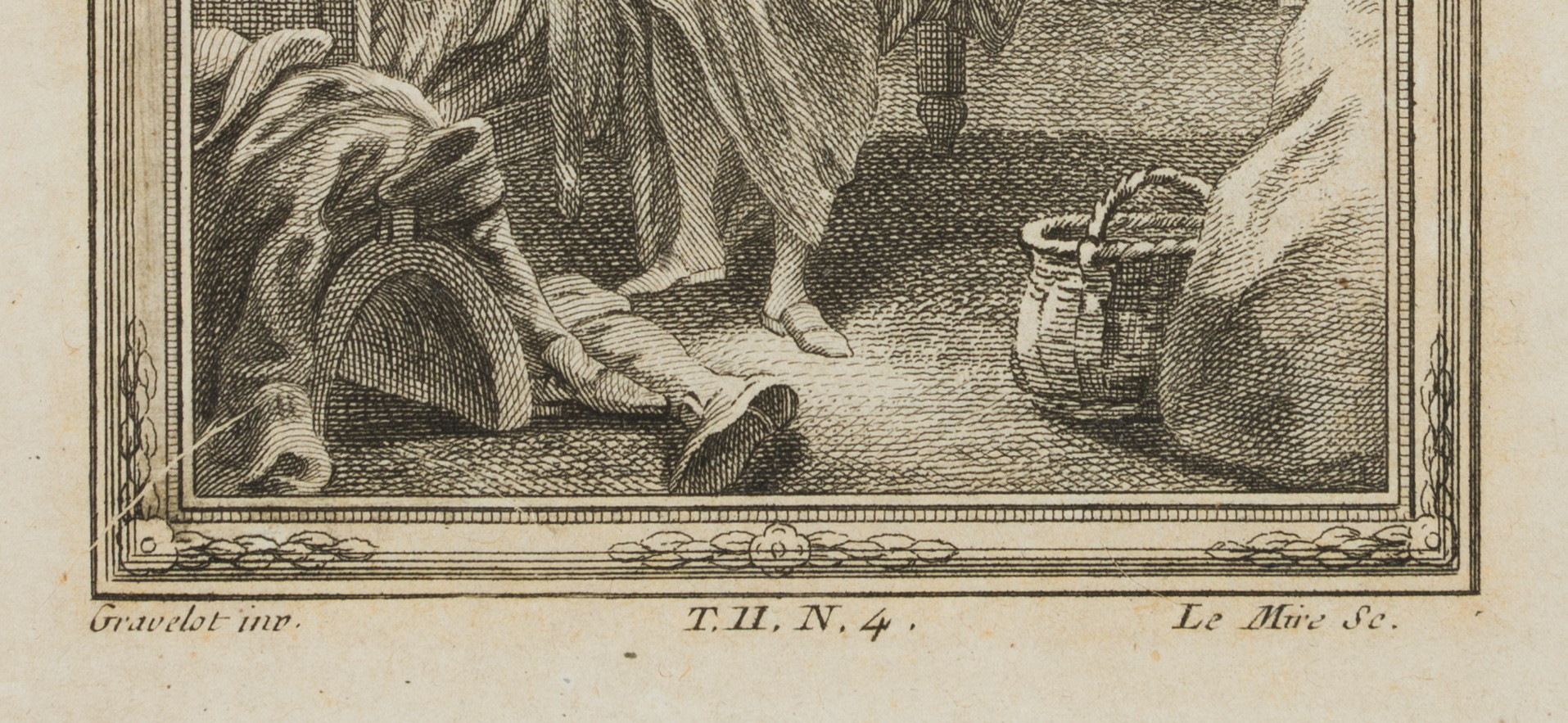 - Inscription: Middle left signed in the printing plate: “N. Le Mire”. At the lower part inscribed in the printing plate: “Gravelot inv. | T. II. N. 4. | Le Mire Sc.””. Middle left dated: “1757”.