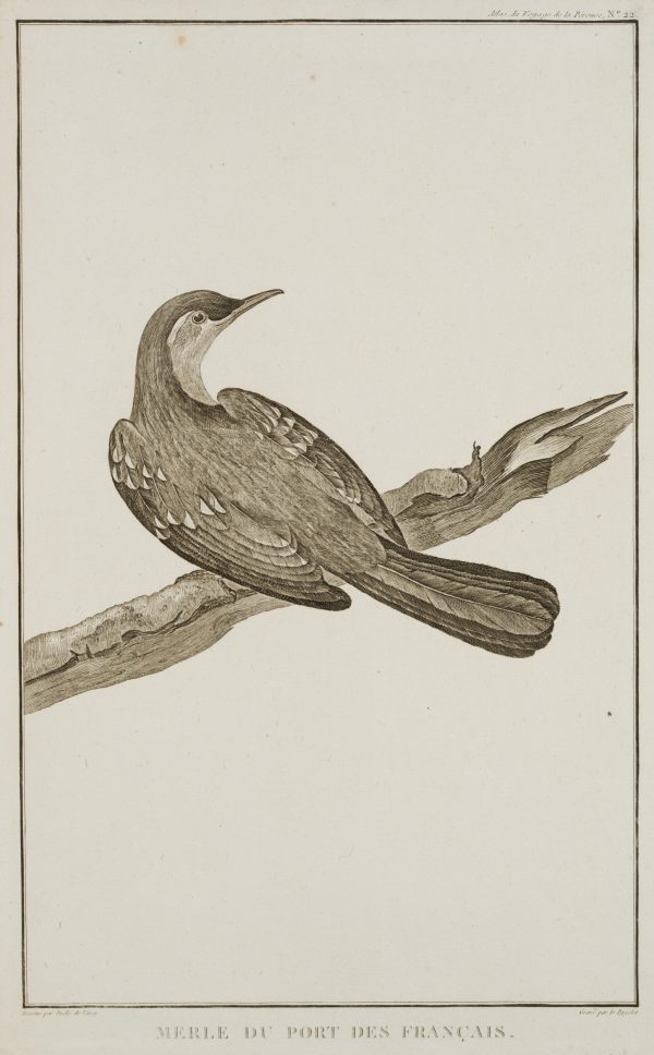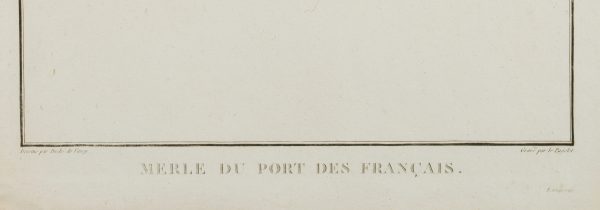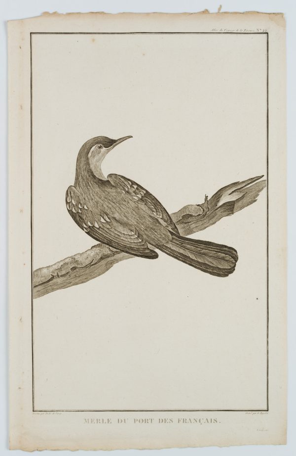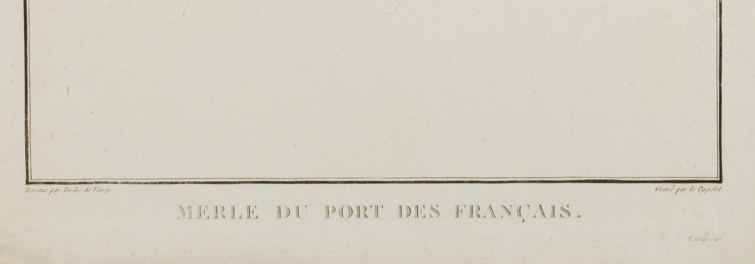 - Inscription: At the lower part inscribed in the printing plate: “Merle du Port des Français. / L. Aubert scrips.”. Upper right numbered in the printing plate: “Atlas du voyage de La Pérouse No 22”.