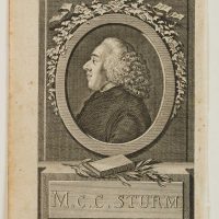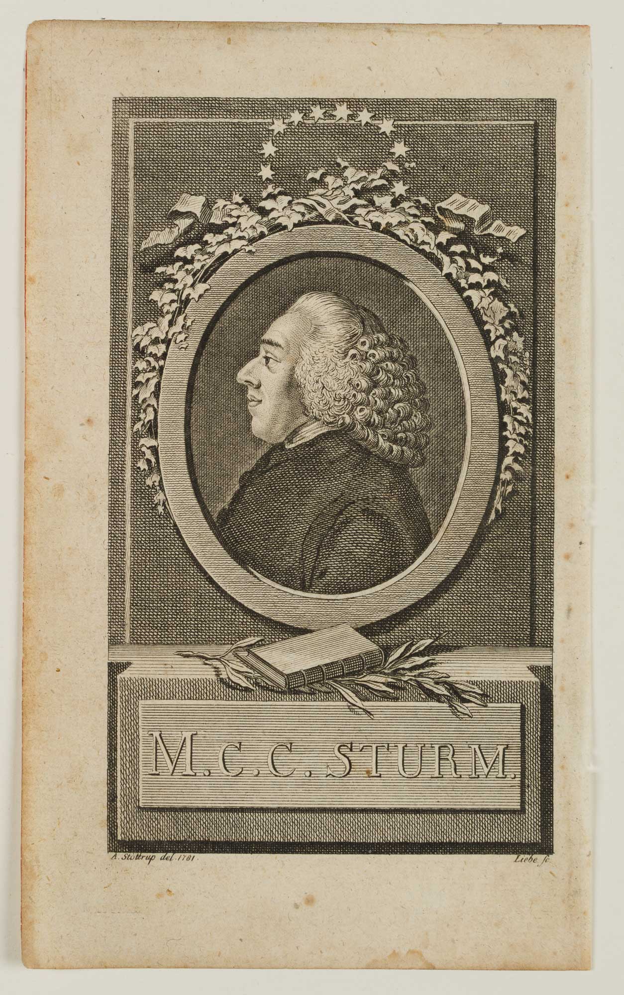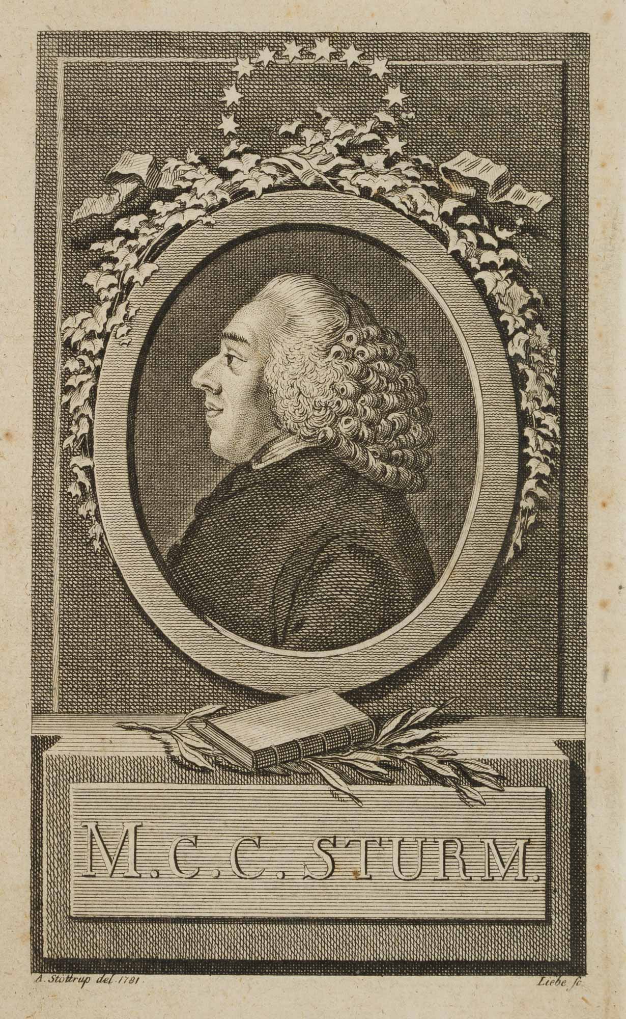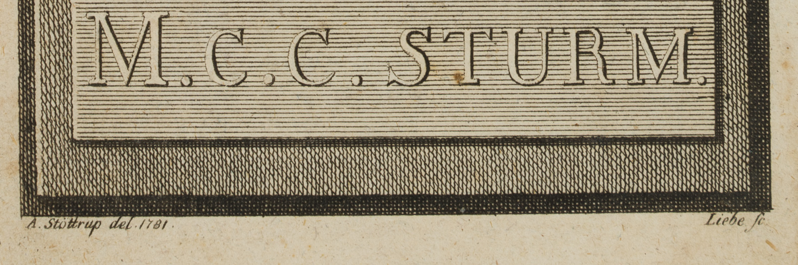 - Beschreibung: Unter der Darstellung betitelt “M.C.C. STURM”, unter der Darstellung signiert “A. Stottrup del. 1781 / Liebe sc.”. Titelkupfer zu Sturms “Unterhaltungen mit Gott, in den Morgenstunden, auf jeden Tag des Jahres”.
