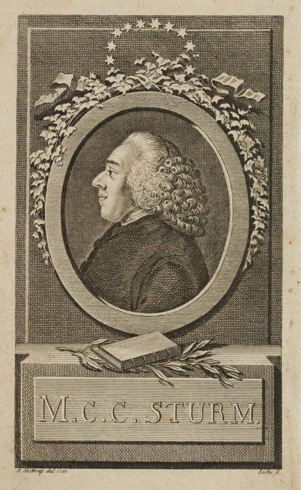Gottlob August Liebe (1746 Halle an der Saale – 1819 ebd.) nach Andreas Georg Stottrup (1789 – 1835 ), Brustbild des Christoph Christian Sturm (1740 Augsburg-1786 Hamburg), Pastor und Schriftsteller, “Unterhaltungen mit Gott”, Titelkupfer, 1781, Kupferstich