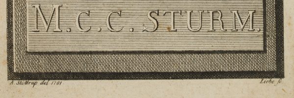 - Description: Titled “M.C.C. STURM” below the image, signed “A. Stottrup del. 1781 / Liebe sc.” below the image. Title copperplate to Storm’s “Conversations with God, in the Morning Hours, on Every Day of the Year”.