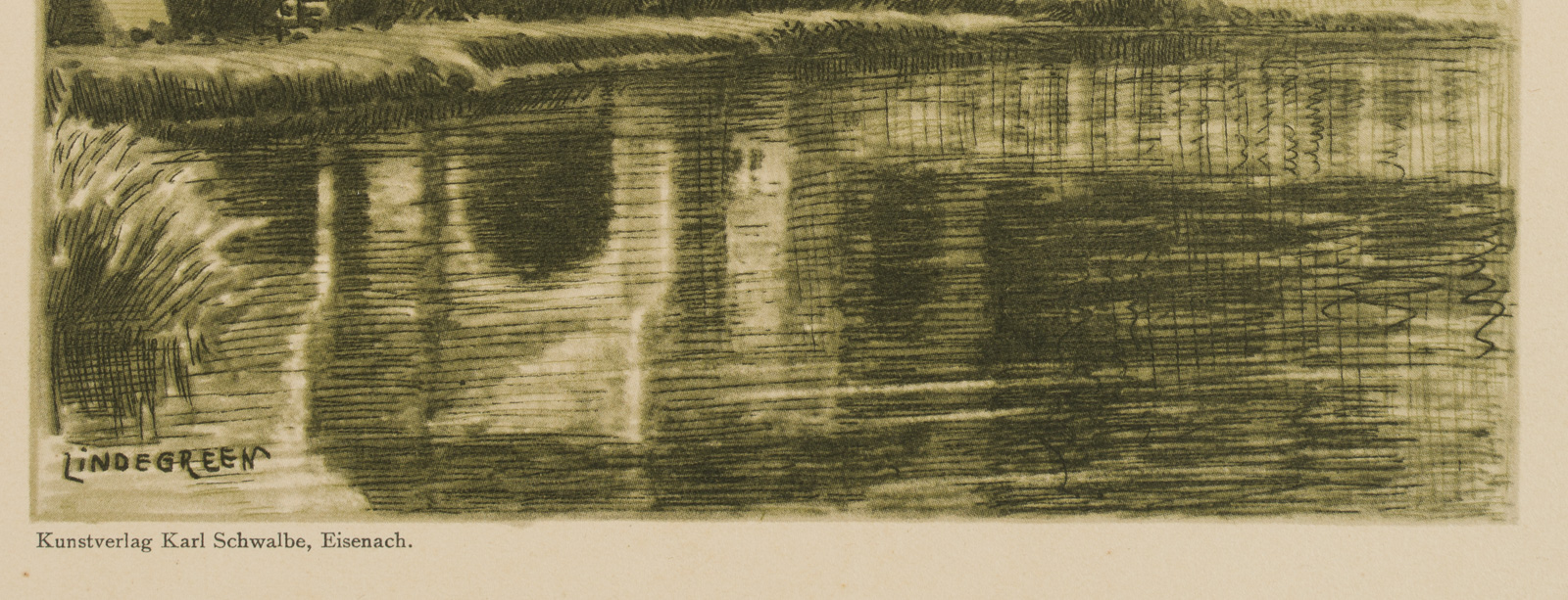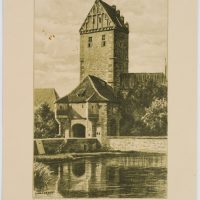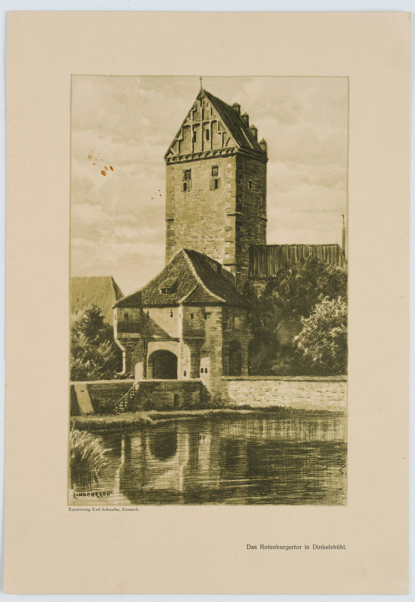 - Description: The Rothenburg Gate is one of the four preserved medieval town gates in the old town of Dinkelsbühl. It was built around 1390 and still has its original appearance today. Signed “LINDEGREEN” in the lower left of the image, inscribed below.