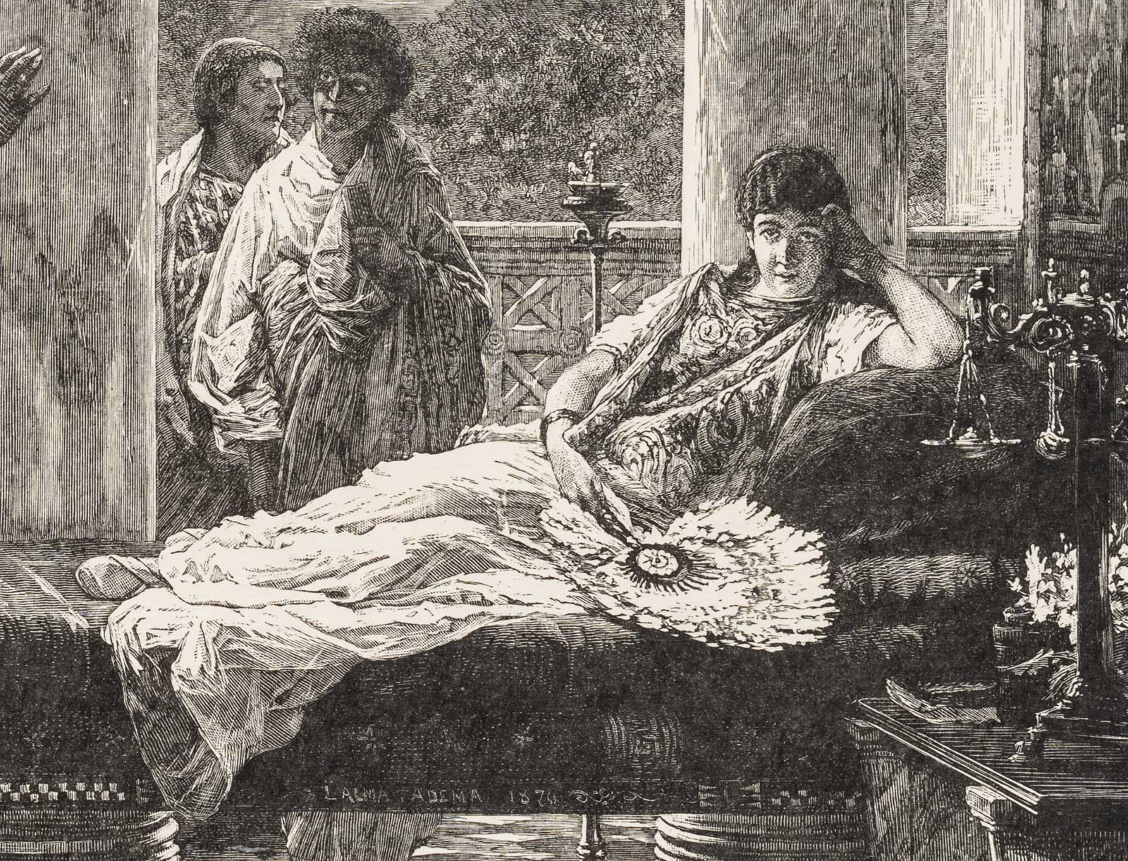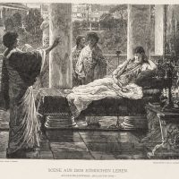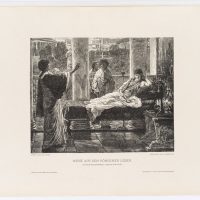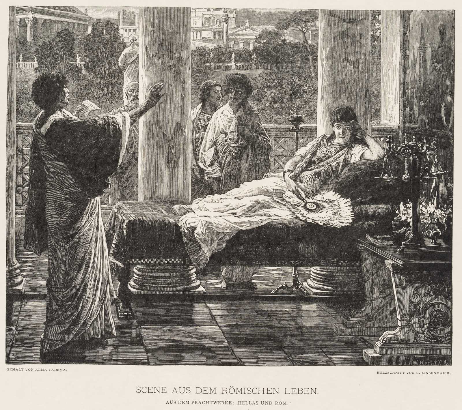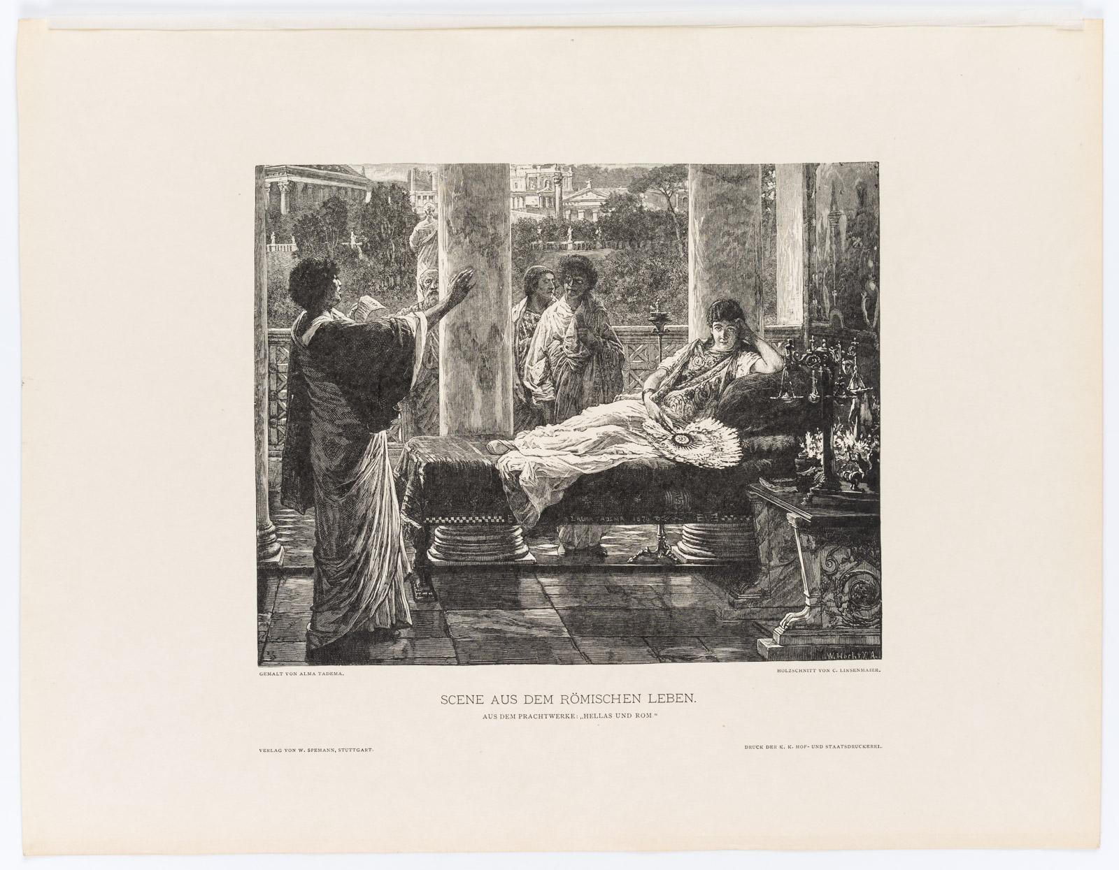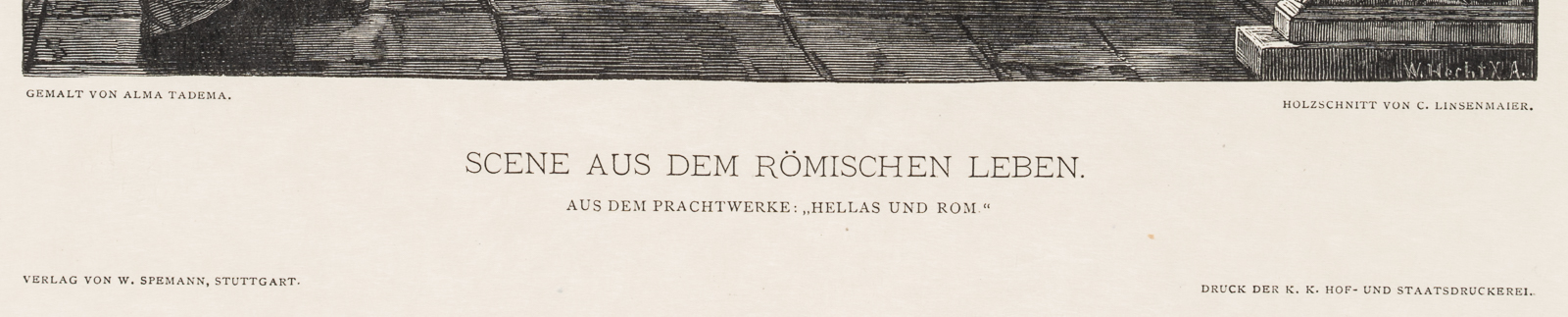 - Description: Signed in the centre of the depiction (on the canapé) with “ALMA TADEMA 1870” and on the lower right with “W. Hecht X. A.”; signed in block letters on the left below the depiction with “GEMALT VON ALMA TADEMA” and on the right with “HOLZSCHNITT VON C. LINSENMAIER.”, inscribed below with “SCENE FROM ROMAN LIFE.”.