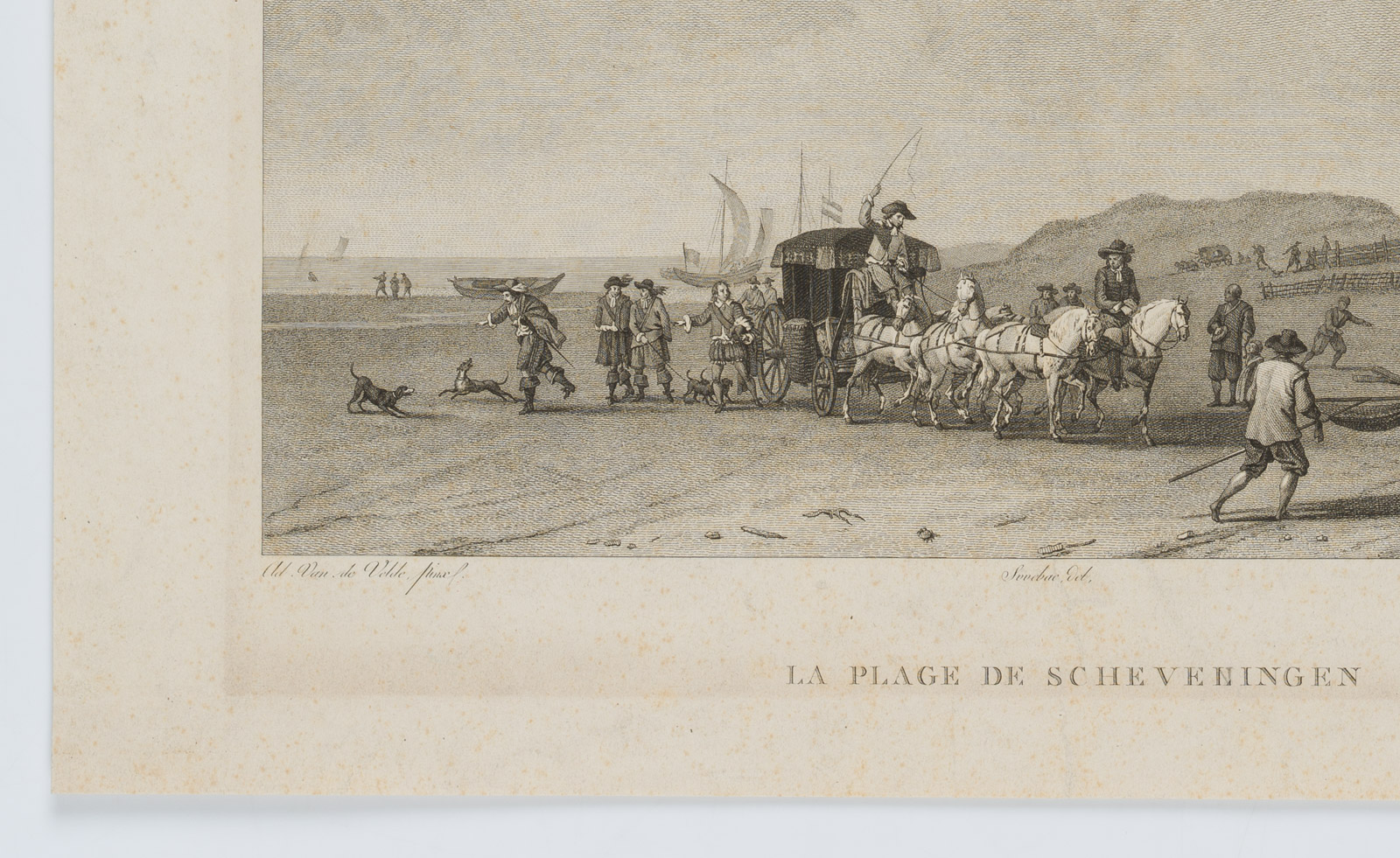 F. B. Lorieux (around 1786 – around 1810 ) after Adriaen van de Velde (1636 Amsterdam – 1672 ibid.), ‘La Plage de Schevelingen’ (Scheveningen, Netherlands), beach landscape with 6-horse carriage, dogs, sailors, fishing boats and a church tower in the background., 1803, Etching