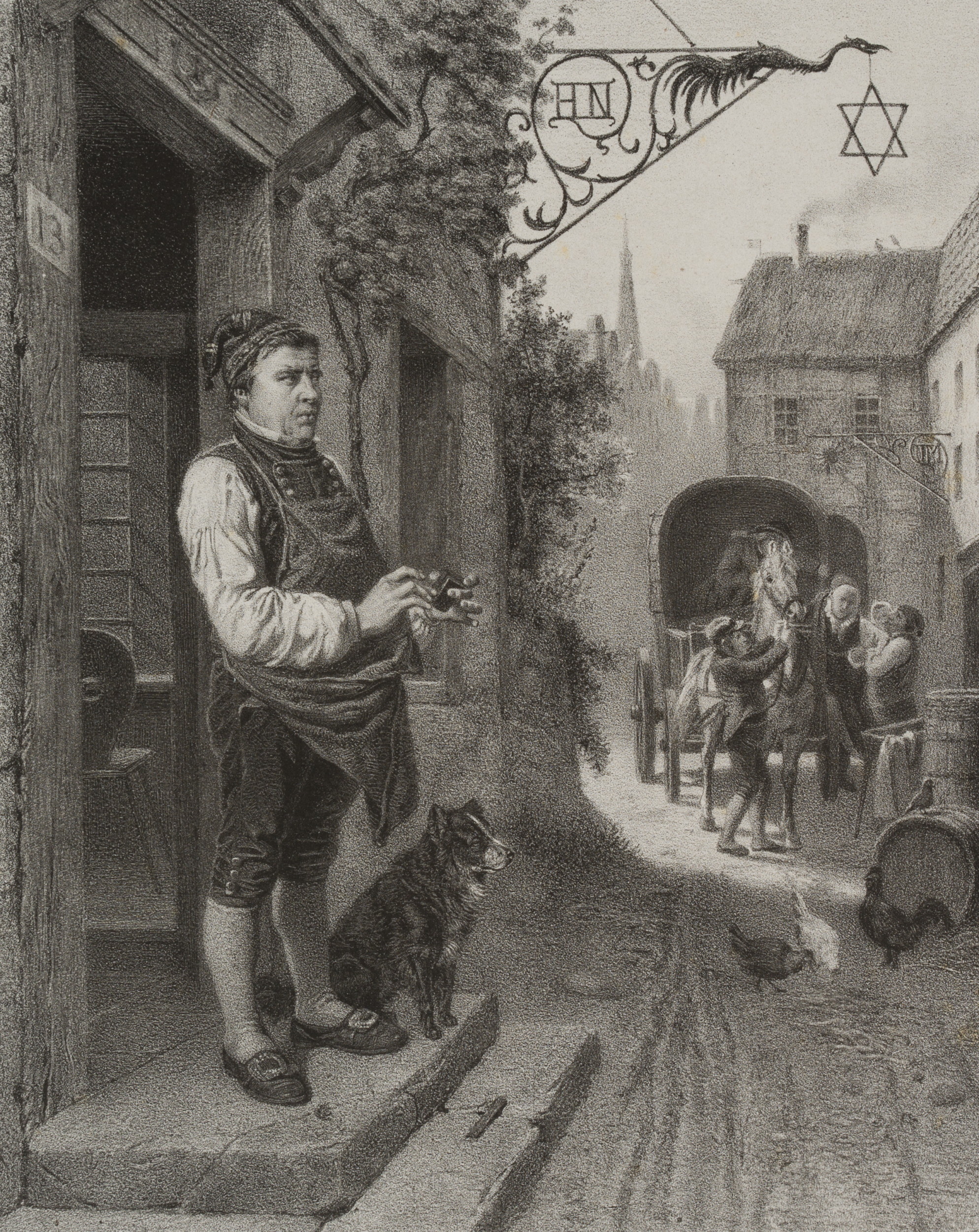 August Lüttmann (around 1830 Hamburg – 1882 Düsseldorf) after Friedrich Peter Hiddemann (1829 – 1892 ), ‘Brodneid’ Street scene and neighbourly togetherness, c. 1860, Lithography