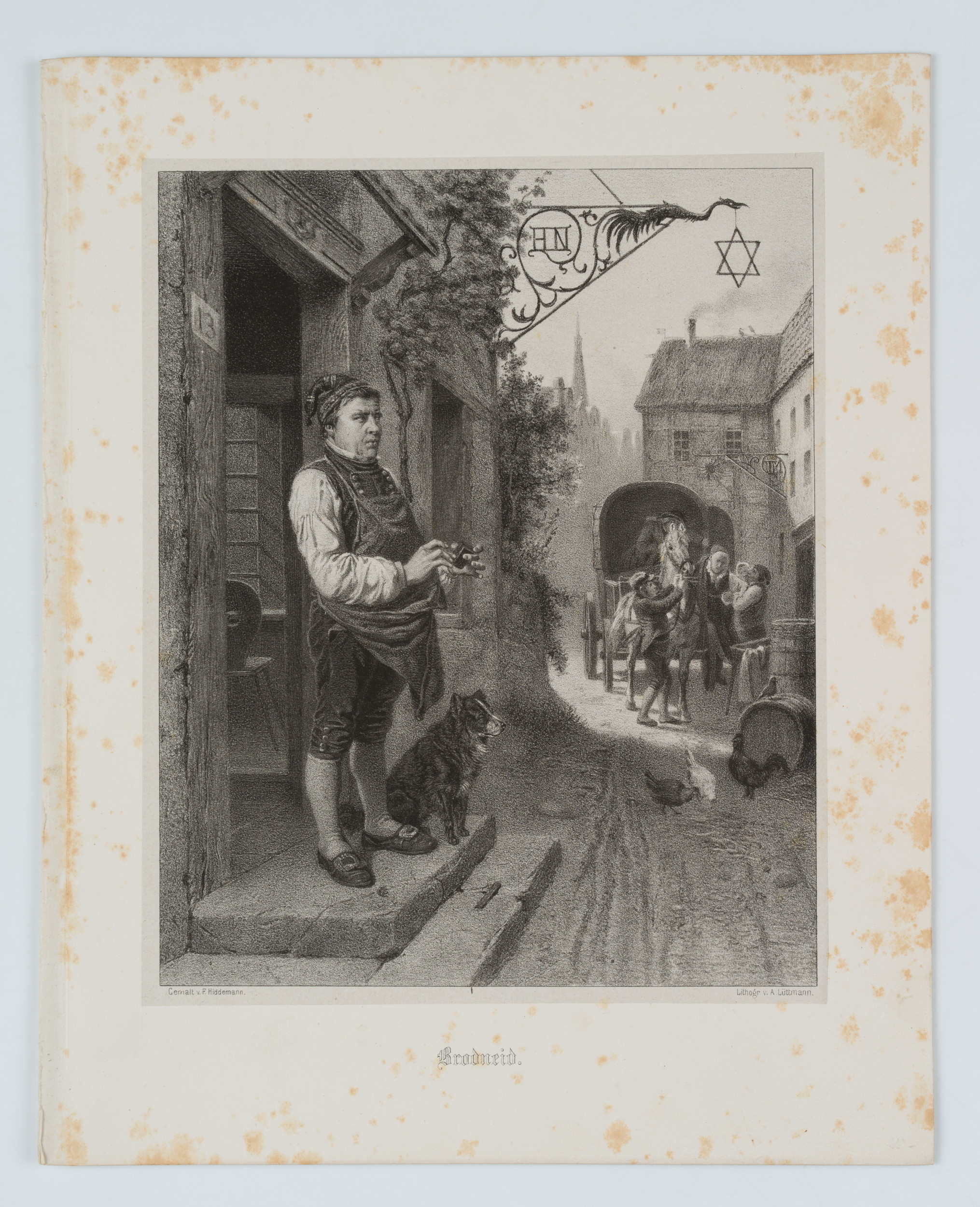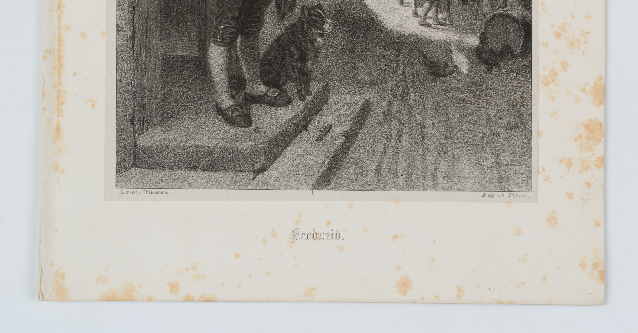 • Bezeichnung: Unten mittig im Druck signiert: “Gemalt v. F. Hiddemann. | Lithogr v. A. Lüttmann”. Unten mittig im Druck bezeichnet: “Brodneid.”.