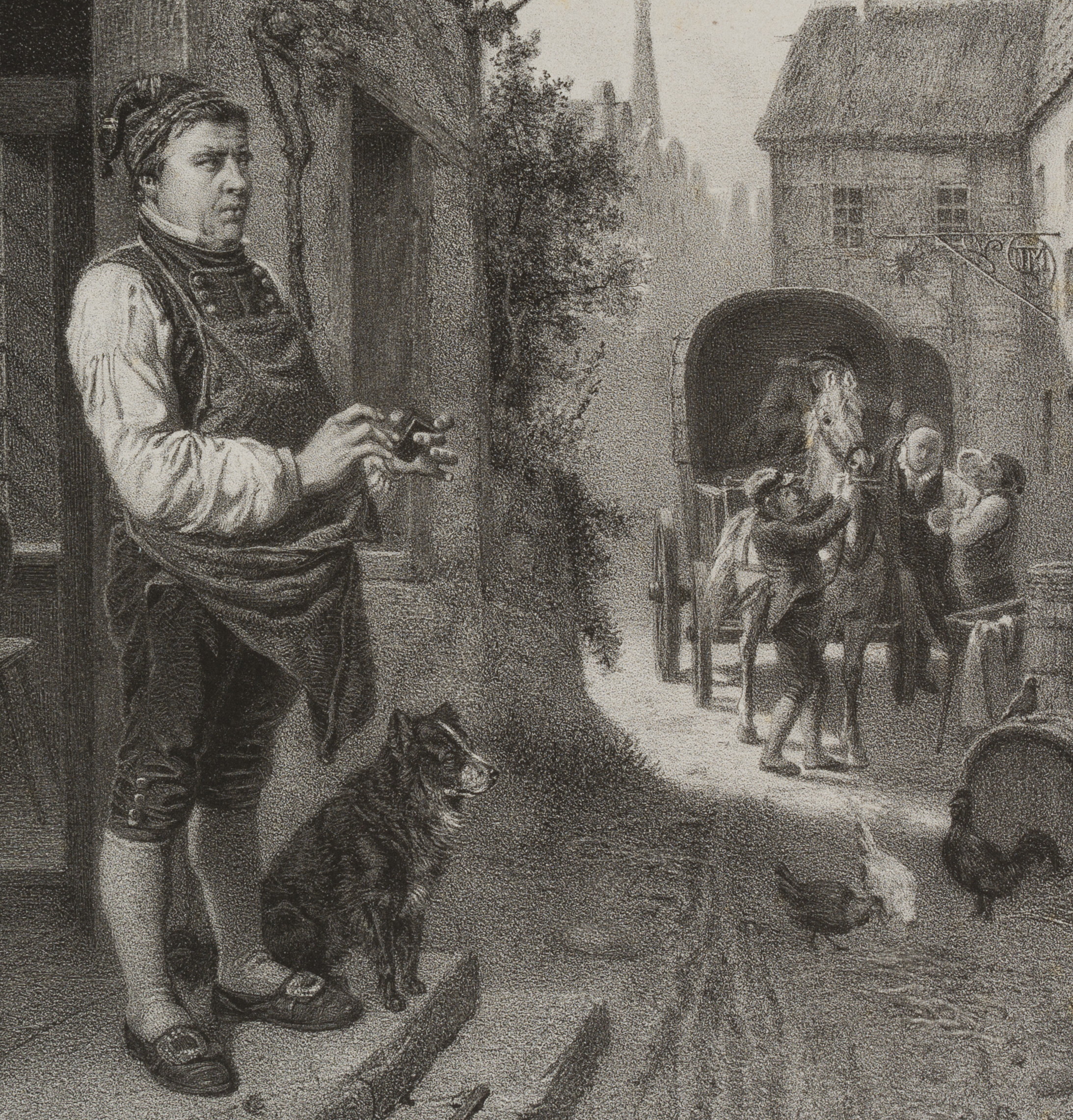 August Lüttmann (um 1830 Hamburg – 1882 Düsseldorf) nach Friedrich Peter Hiddemann (1829 Düsseldorf – 1892 ebd.), ‘Brodneid’. Straßenszene und nachbarschaftliches Miteinander, um 1860, Lithographie