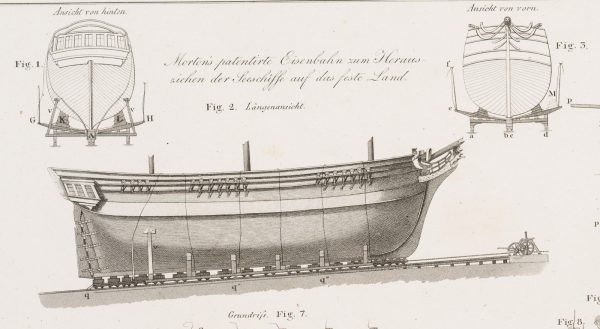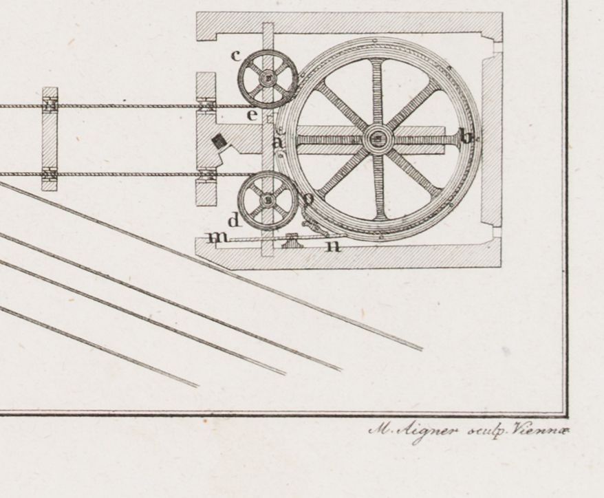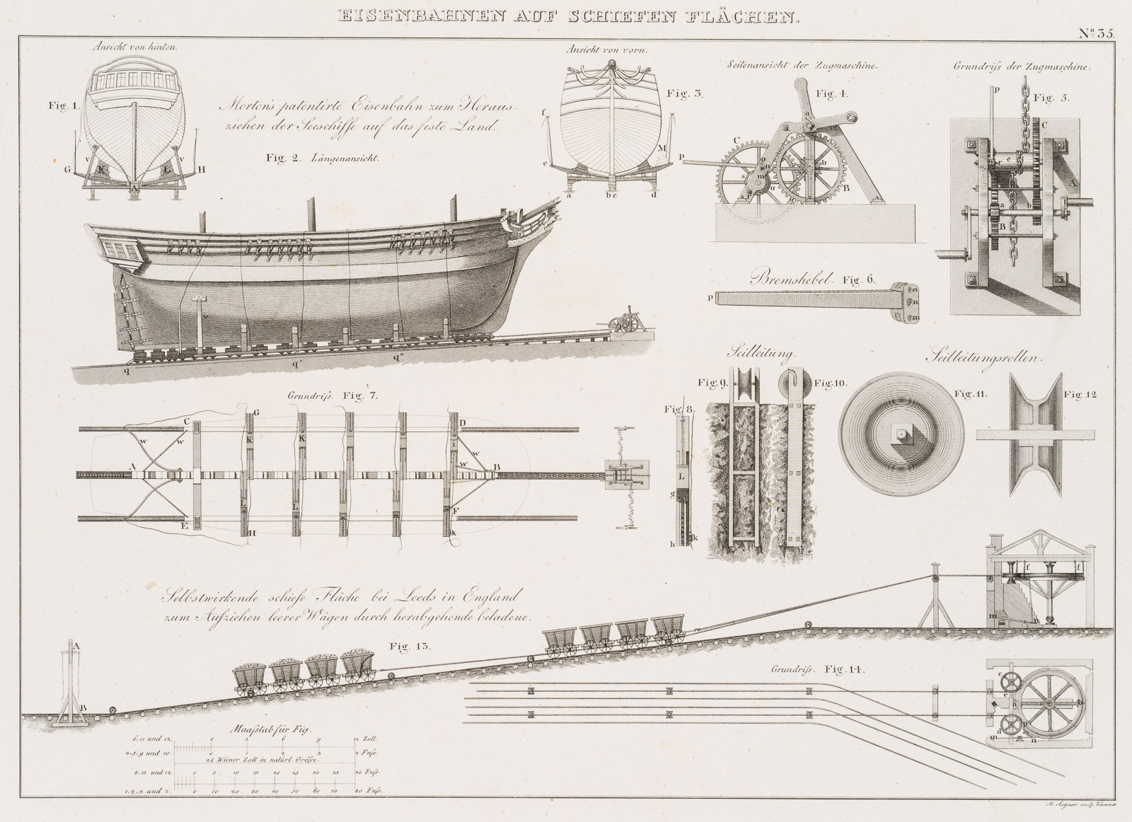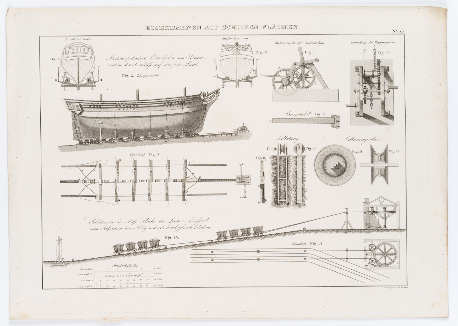 Matthäus Aigner (1818 – 1886 ), Konstruktionszeichnungen, Hinweise zu ‘Eisenbahnen auf schiefen Flächen’, Grundrisse und verschiedene Ansichten von Zugmaschinen, um 1830, Kupferstich