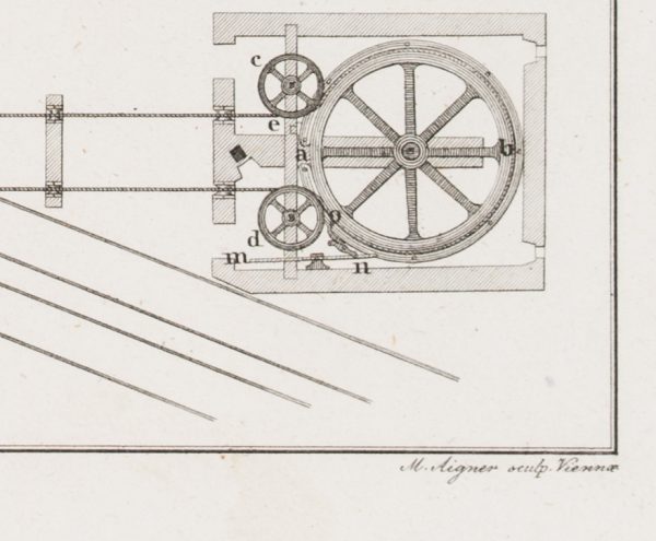 - Bezeichnung: Unterhalb mit Angaben zum Maßstab. Rechts unterhalb der Graphik signiert mit “M Aigner sculp Vienna”.