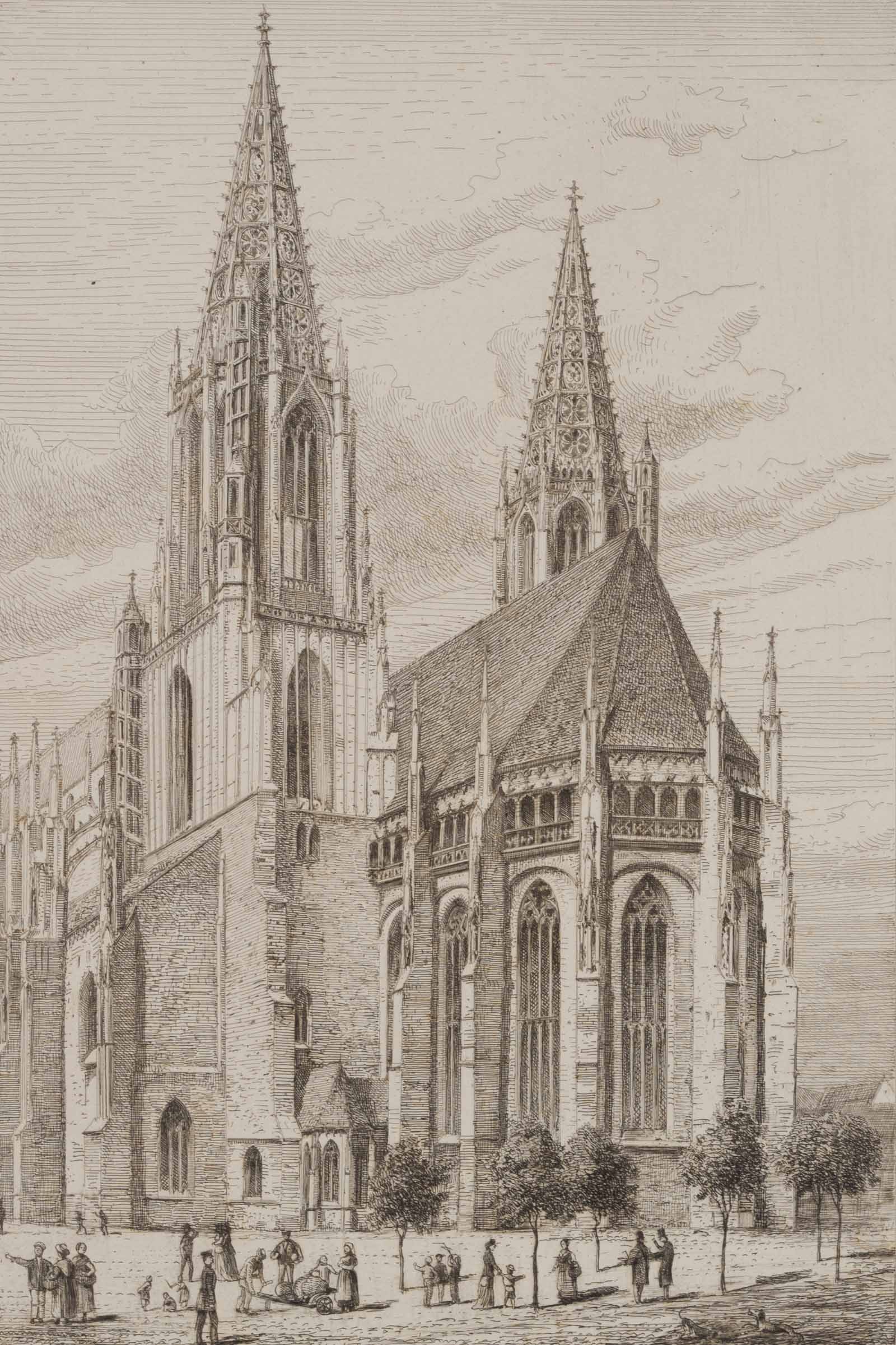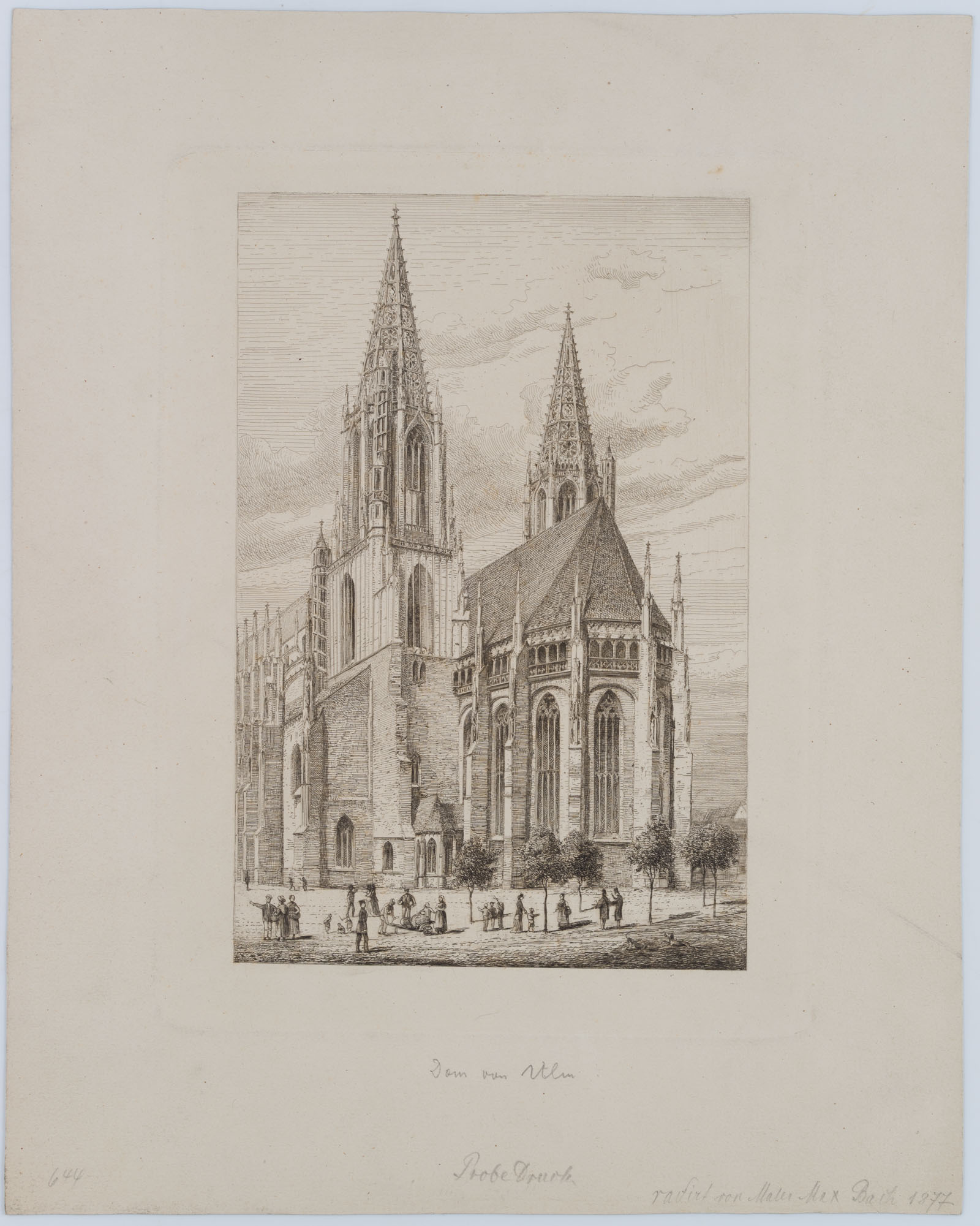 - Description: Inscribed lower right below the image “etiert von Maler Max Bach 1877”, named “Dom zu Ulm”, “Probedruck”. View of Ulm Cathedral, a church in Ulm built in the Gothic architectural style. The foundation stone was laid in 1377, when Ulm was a free imperial city and still Roman Catholic. The sermons of the Ulm reformer Konrad Sam were groundbreaking for the gradual introduction of the Reformation in Ulm. In 1530, the decision was made in a citizens’ vote in favour of the Protestant confession, so Ulm Minster became a place of worship for the Protestant Church. The present sheet shows the cathedral in 1877, i.e. before the completion of the tower in 1890.
