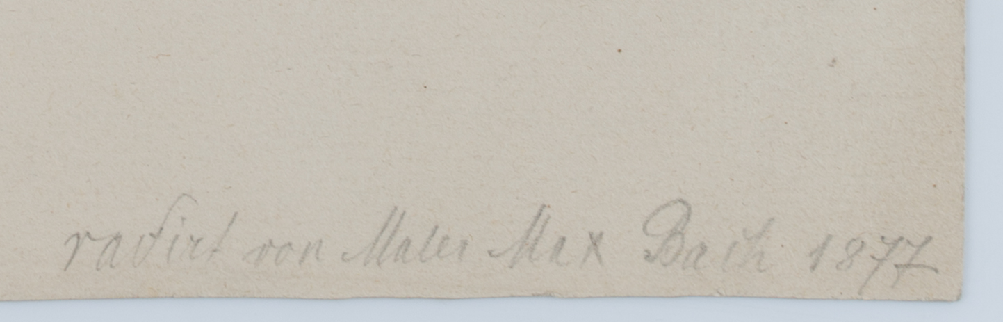 - Beschreibung: Bezeichnet unten rechts unterhalb der Darstellung “radiert von Maler Max Bach 1877”, benannt “Dom zu Ulm”, “Probedruck”. Blick auf das Ulmer Münster, eine im gotischen Baustil errichtete Kirche in Ulm. Der Grundstein wurde 1377 gelegt, als Ulm eine freie Reichsstadt und noch römisch-katholisch war. Die Predigten des Ulmer Reformators Konrad Sam waren wegweisend für die schrittweise Einführung der Reformation in Ulm. 1530 fiel die Entscheidung in einer Bürgerabstimmung zugunsten des evangelischen Bekenntnisses, so wurde das Ulmer Münster ein Gotteshaus der evangelischen Kirche. Das vorliegende Blatt zeigt das Münster im Jahr 1877, also noch vor der Vollendung des Turmes im Jahre 1890.