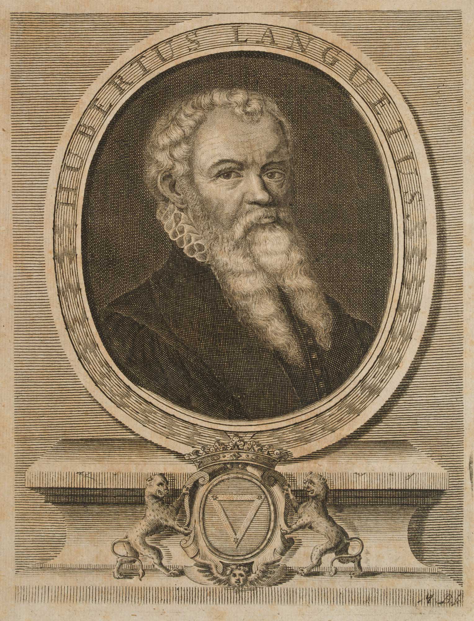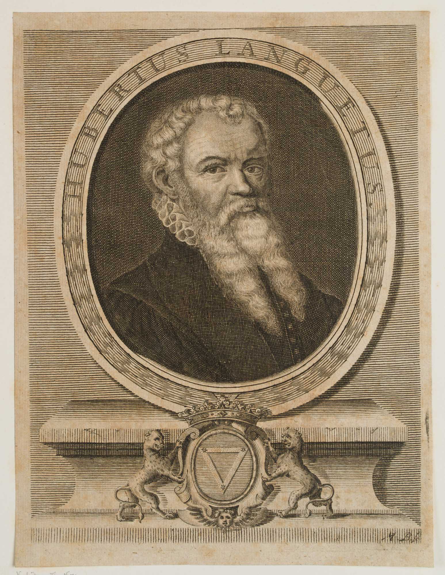 - Bezeichnung: Unten rechts innerhalb der Druckplatte monogrammiert “M. B. Sc.”. Porträt des französischen Diplomaten und Juristen Hubert Languet (1518 Vitteaux bei Dijon – 1581 Antwerpen) im Oval. Der Porträtierte ist im schwarzen Wams und mit Halskrause dargestellt, unten vor dem Sockel mit einem von zwei Leoparden flankierten Wappen. Languet studierte in Padua und Bologna und unternahm Reisen nach Italien und Spanien; ab 1559 auf Melanchthons Empfehlung Diplomat im Dienst des Kurfürsten von Sachsen; von 1573-1576 lebte er am Hof des Kaisers Maximilian II., den er auf seinen Reisen begleitete. (Lit.Nagl. Mon. IV, 1671.).